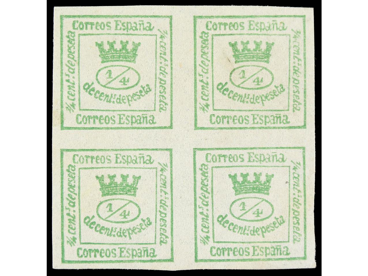ESPAÑA. 4 cuartos verde en bloque, con 5 sellos de 1 cuarto. LUJO. Ed.130. (Image1)