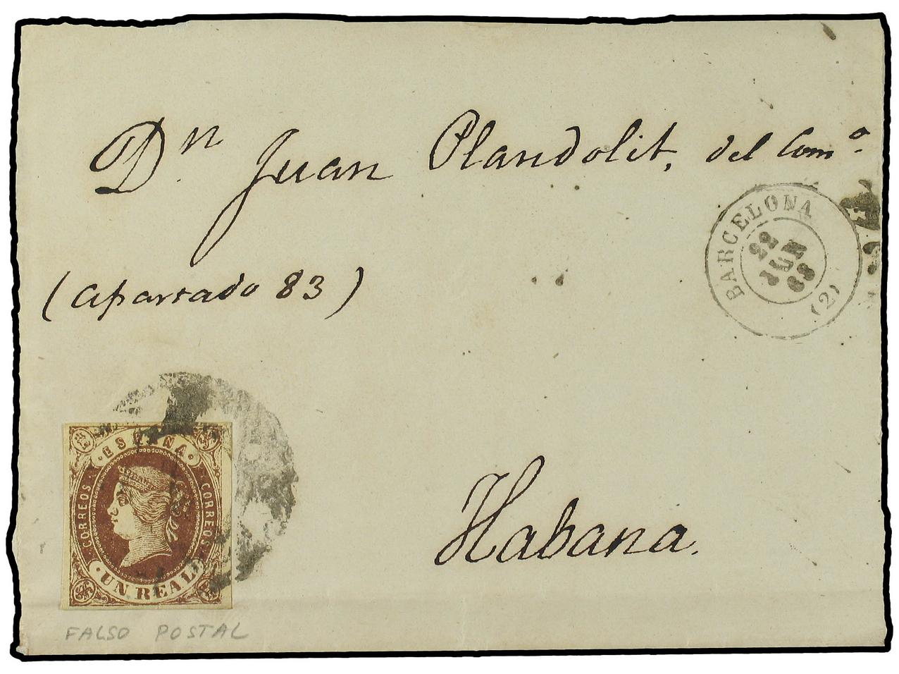 ESPAÑA. 1864. BARCELONA a HABANA. 1 real castaño FALSO POSTAL. Extraordinariamente raro en carta, firma manuscrita de M. Galvez y cert. GRAUS. Ed.67F.