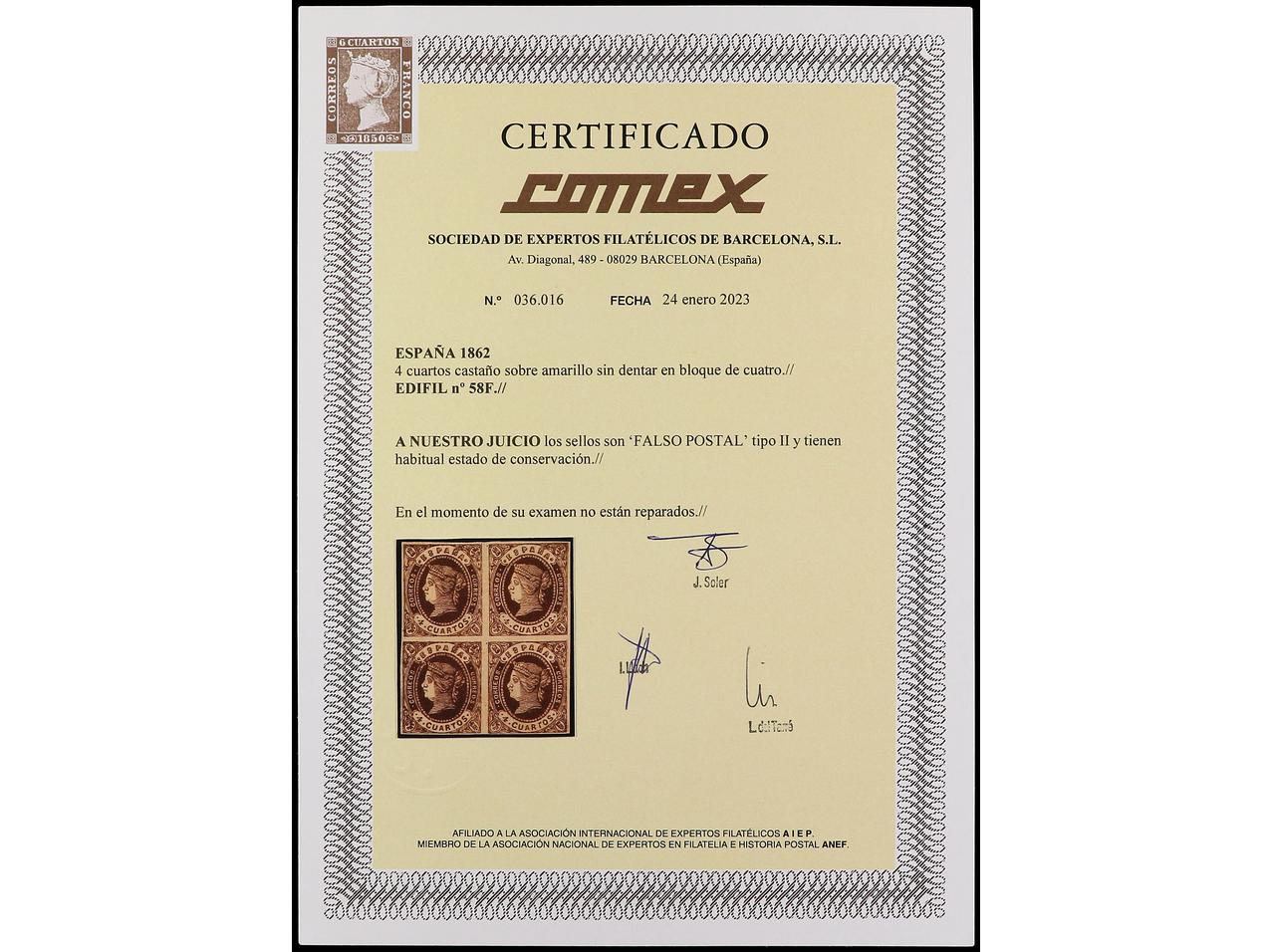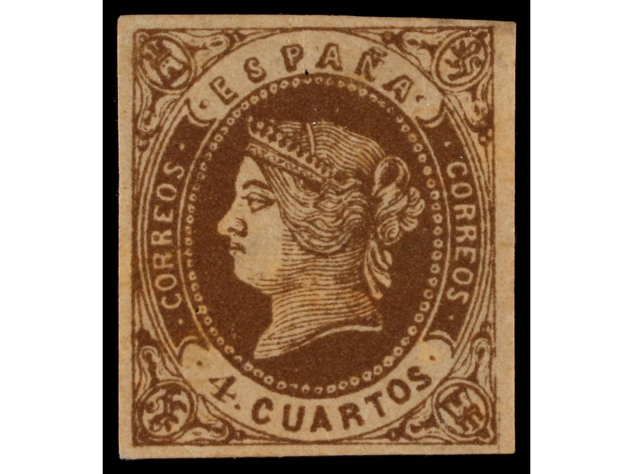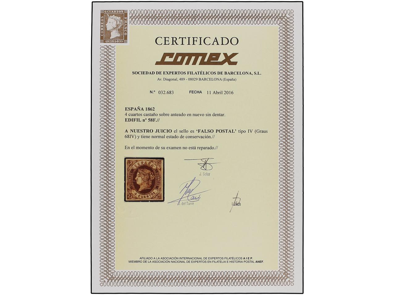 ESPAÑA. 4 cuartos castaño FALSO POSTAL, tipo I. Muy raro en nuevo. Ex. col. GRAUS. Cert. COMEX. Ed.58F. (Image1) (Image2)
