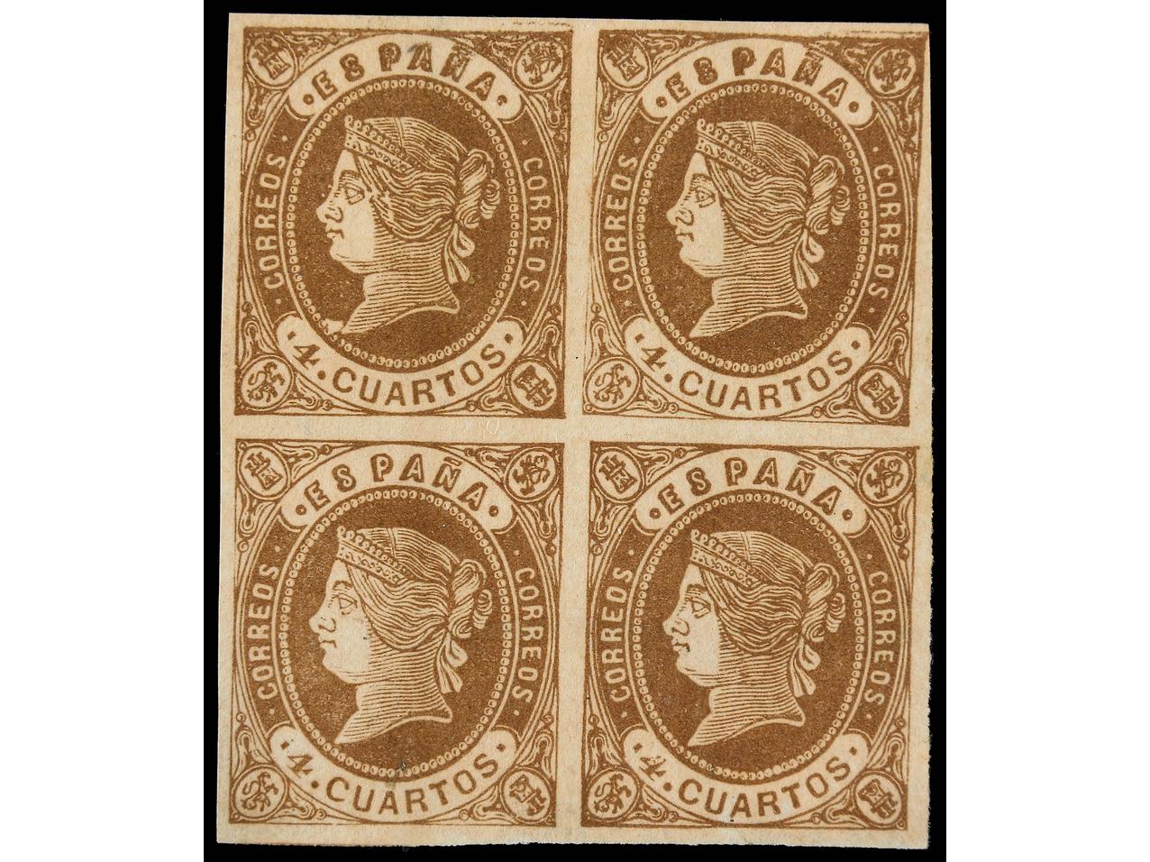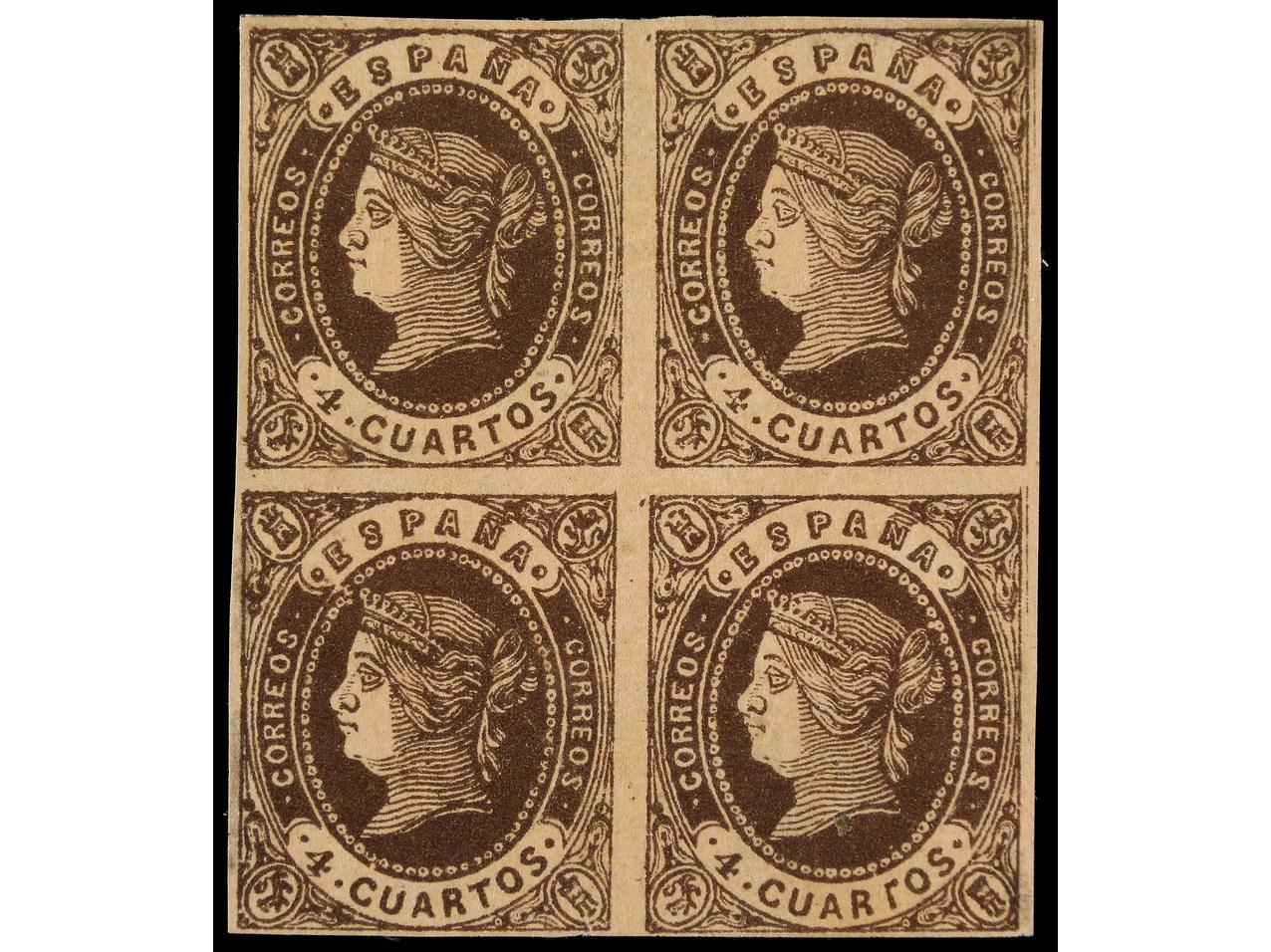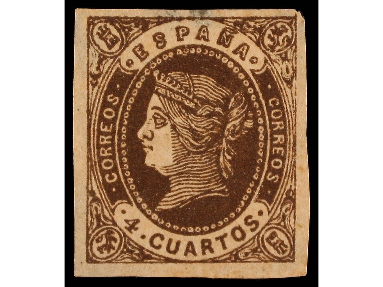 ESPAÑA. 4 cuartos castaño FALSO POSTAL, tipo I. Muy raro en nuevo. Ex. col. GRAUS. Cert. COMEX. Ed.58F. (Image1) (Image2)