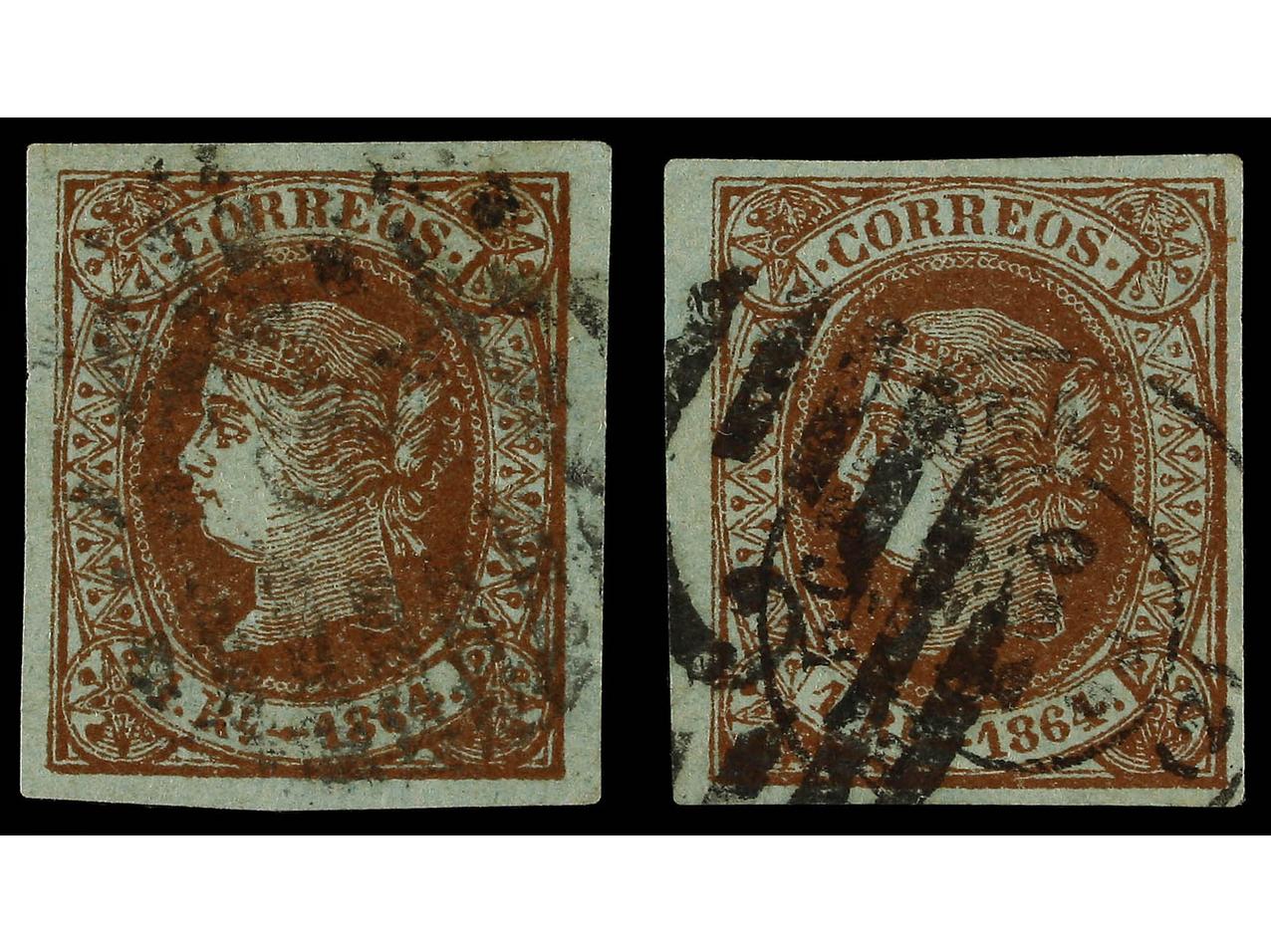 ESPAÑA. 1 real castaño s. azul FALSO POSTAL tipo I (Graus 83I). Dos sellos en usado en Barcelona, uno con mat. PARRILLA y FECHADOR. Ed.67F (2).
