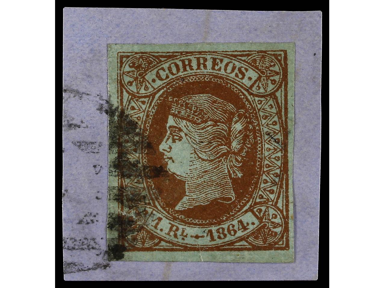 ESPAÑA. 1 real castaño s. azul, FALSO POSTAL tipo I (Graus 83I) sobre pequeño fragmento. MAGNÍFICO. Ed.67F. (Image1)