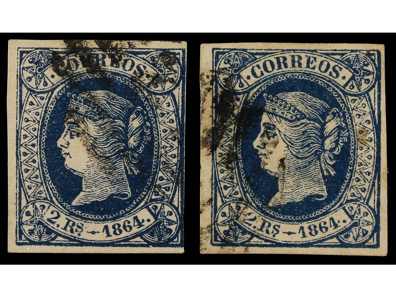 ESPAÑA. 2 reales azul. FALSOS POSTALES tipos I y II usados en BARCELONA (Graus 84 I/II). Ed.68F. (Image1)