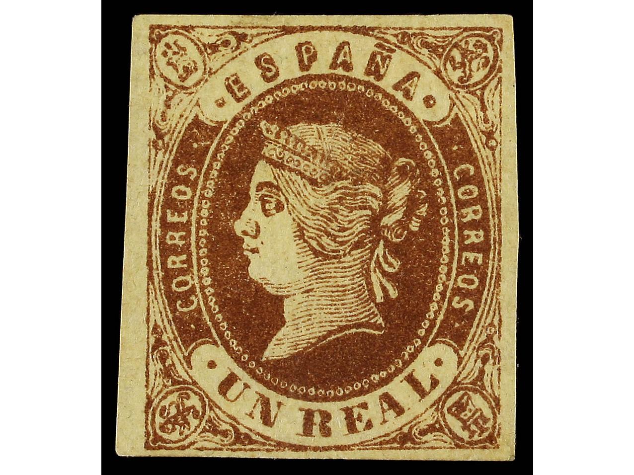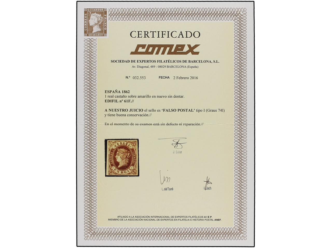 ESPAÑA. 1 real castaño s. amarillo FALSO POSTAL. MUY RARO en nuevo. F. E. Soro (Graus 74 I). Cert. COMEX. Ed.61F. (Image1) (Image2)