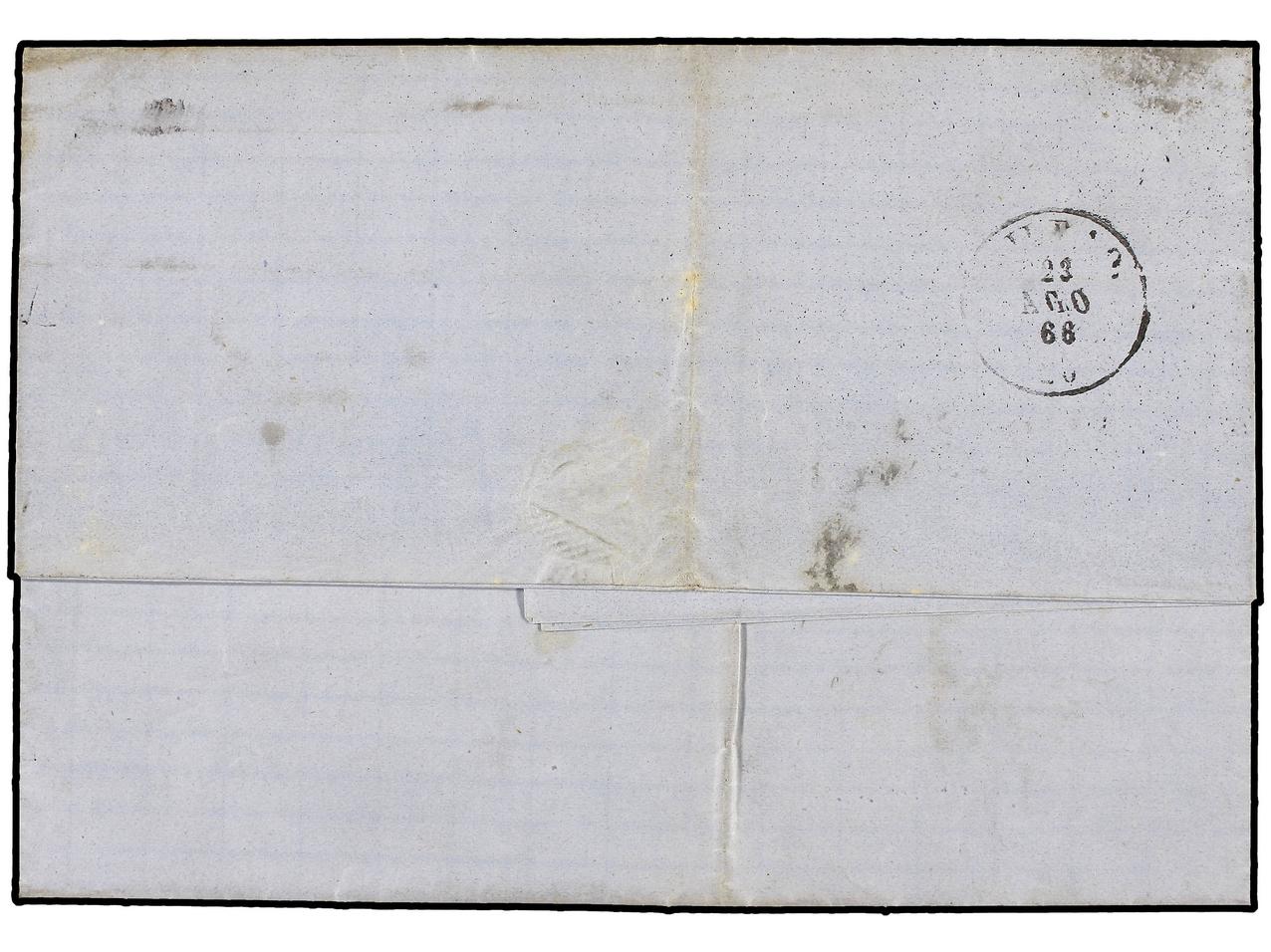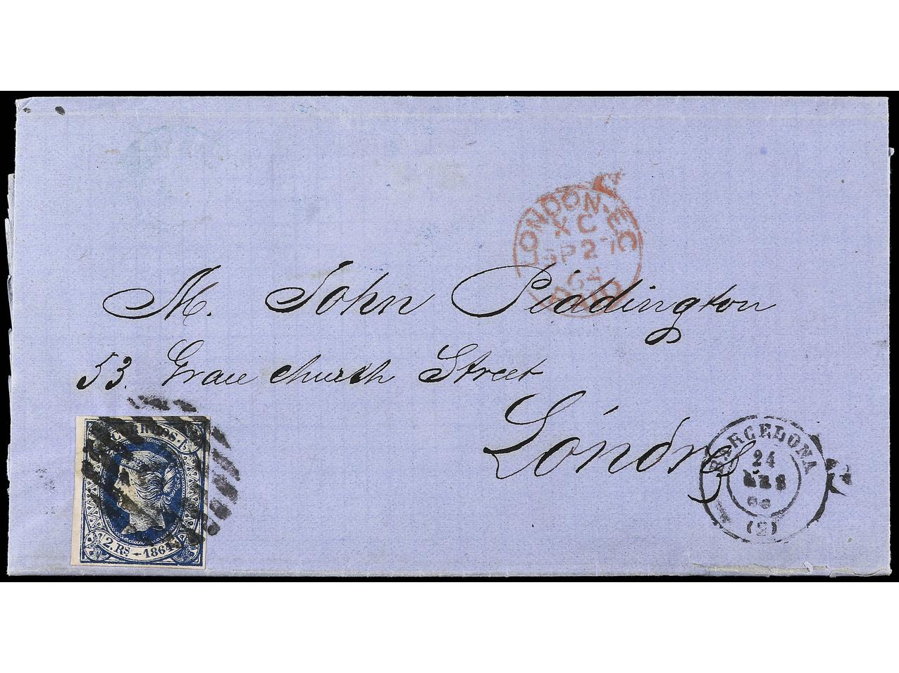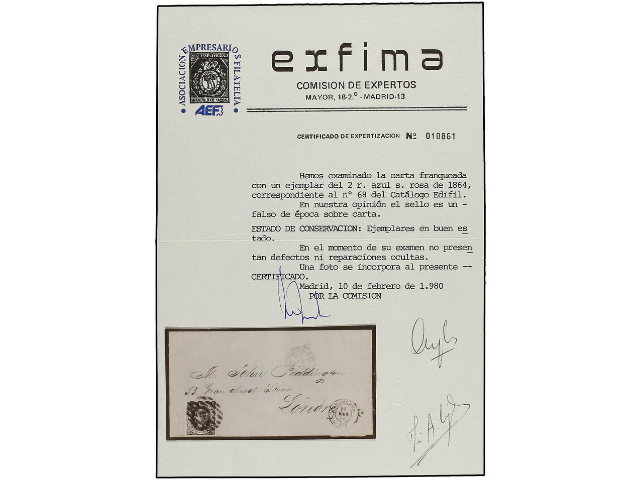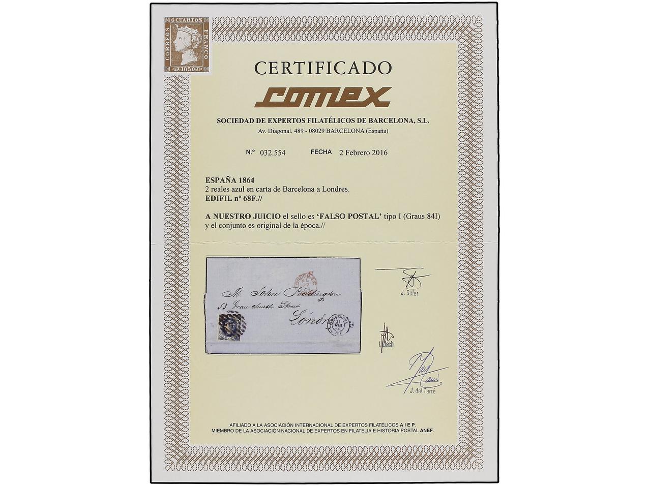 ESPAÑA. 1864. BARCELONA a LONDRES. 2 reales azul FALSO POSTAL tipo I. RARÍSIMO en carta (Graus 84 I). Cert. COMEX. Ed.68F. (Image1) (Image2)