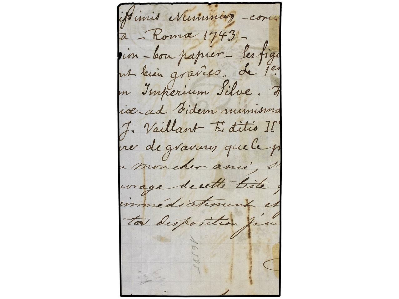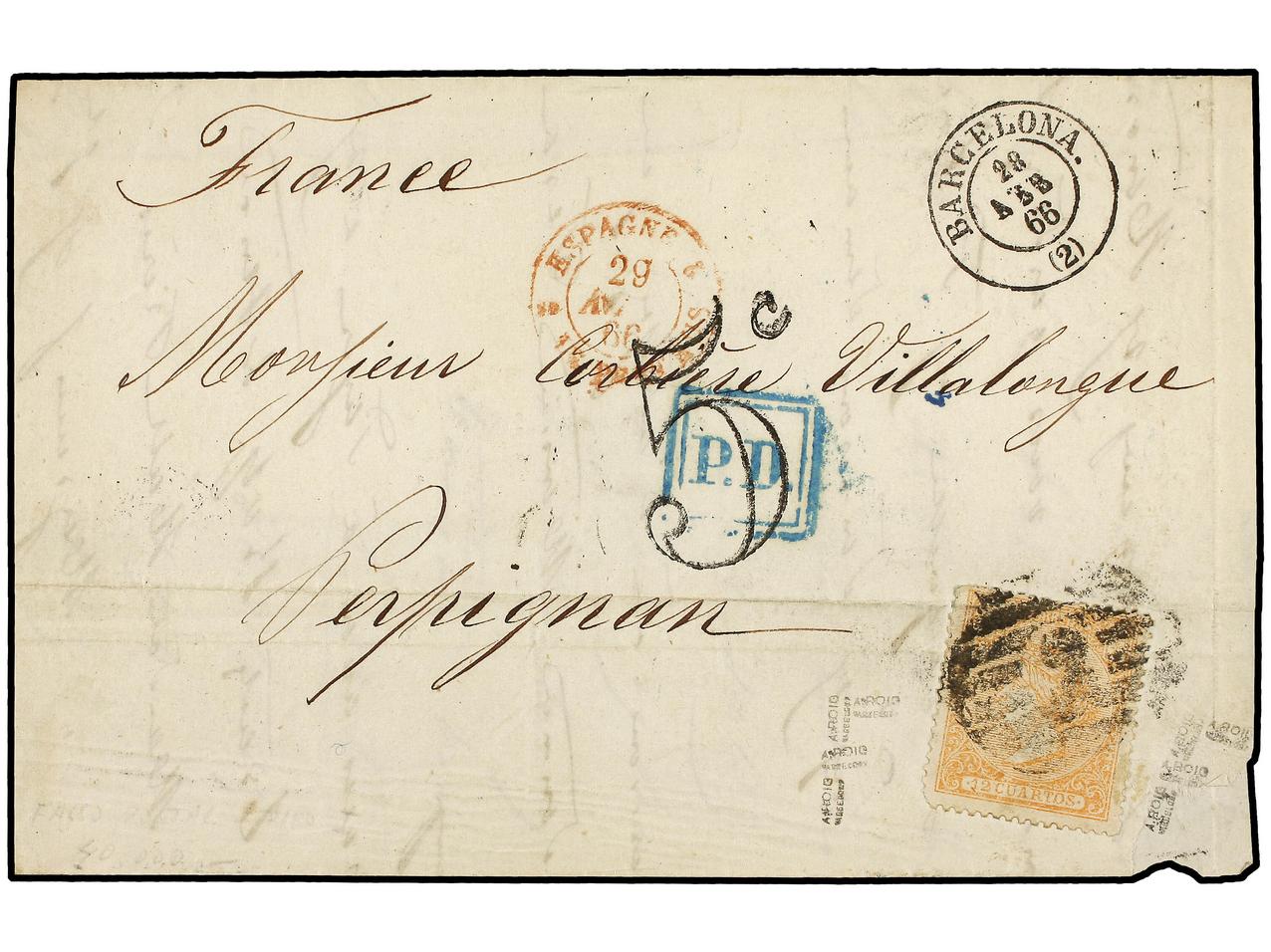 ESPAÑA. 1866. BARCELONA a FRANCIA. 12 cuartos naranja. FALSO POSTAL tipo I. Mat. parrilla con cifra ´2´ y fechador de BARCELONA. (Graus 108 I). Envuelta sin las dos solapas laterales del interior. F. Roig. Ed.82F. (Image1) (Image2)
