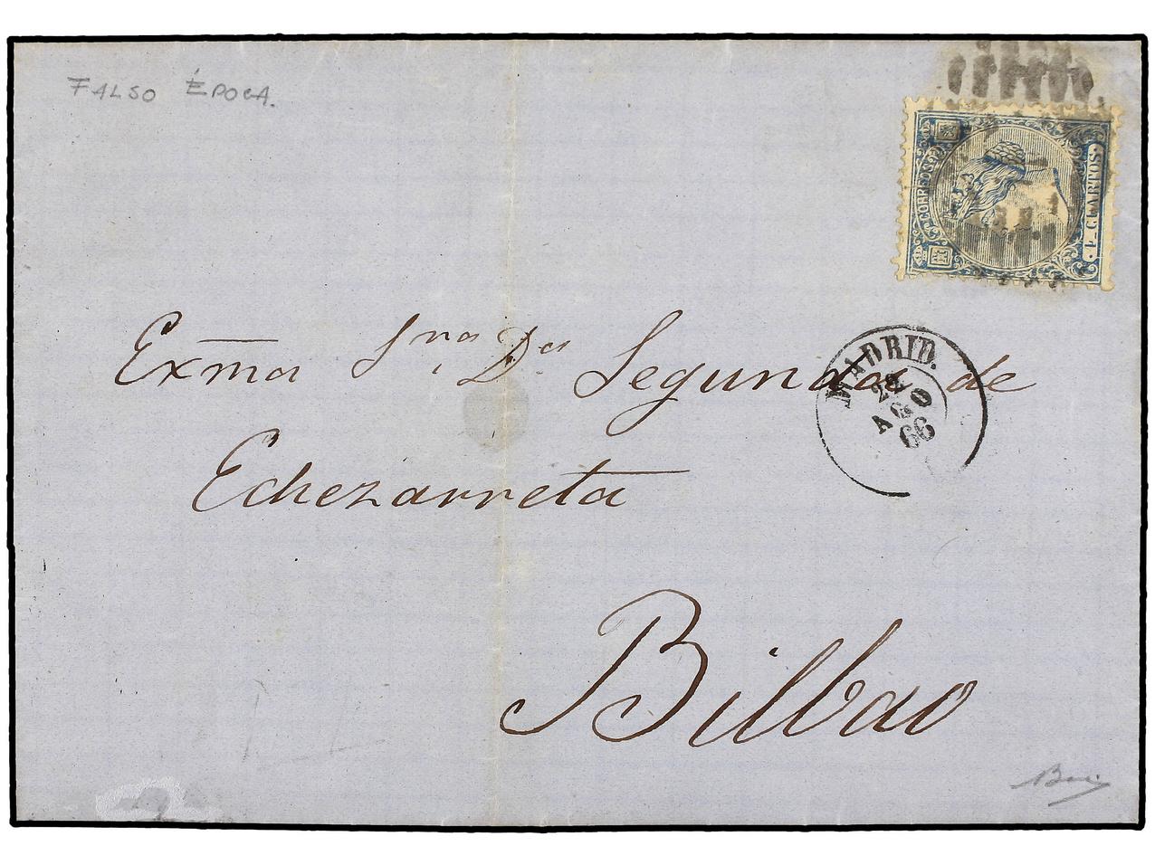 ESPAÑA. 1866. MADRID a BILBAO. 4 cuartos azul. FALSO POSTAL tipo I. Mat. parrilla con cifra ´1´ fechador de MADRID. (Graus 107 I). Ed.81F. (Image1) (Image2)