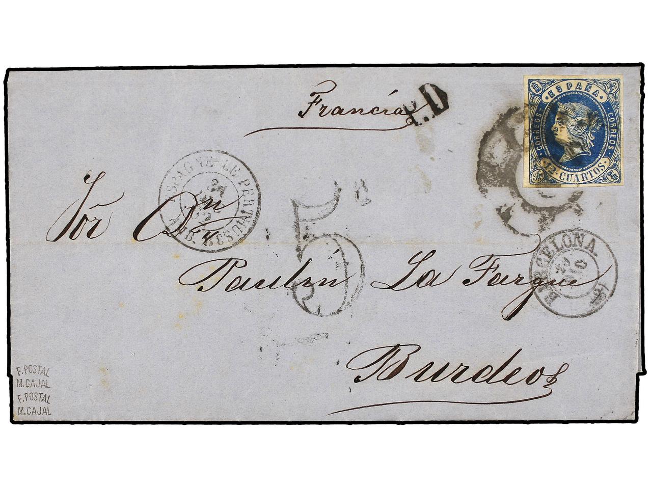 ESPAÑA. 1862. BARCELONA a BURDEOS. 12 cuartos azul. FALSO POSTAL tipo I subtipo A. Mat. R. C. 2 y fechador de BARCELONA. (Graus 72 I). Ed.59F.