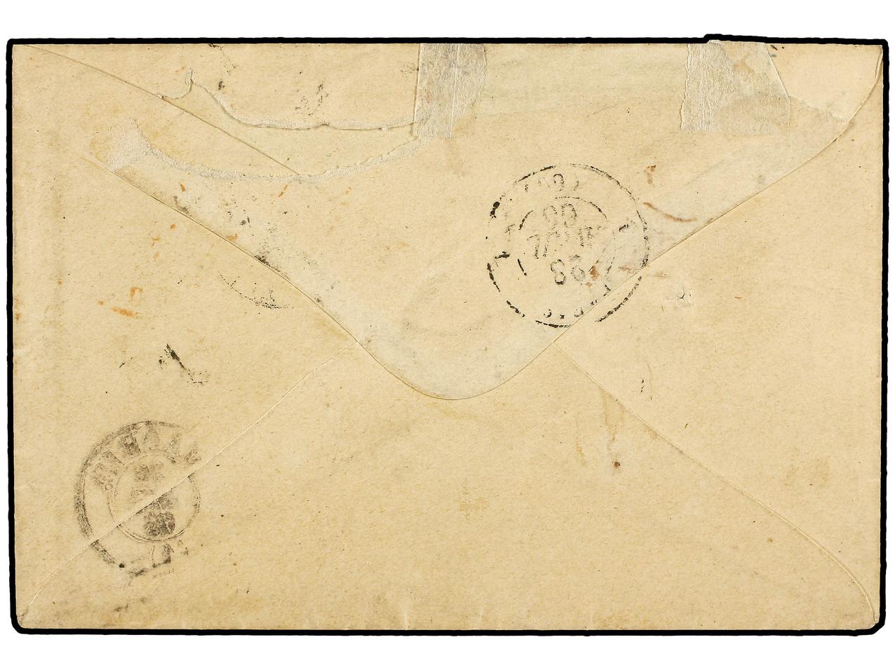ESPAÑA. 1866. MADRID a PARÍS. 12 cuartos naranja. FALSO POSTAL tipo II. Mat. parrilla con cifra ´1´ y fechador de Madrid. (Graus 108 II). RARÍSIMO, único caso conocido del uso de este falso postal en Madrid. Ed.82F. (Image1) (Image2)