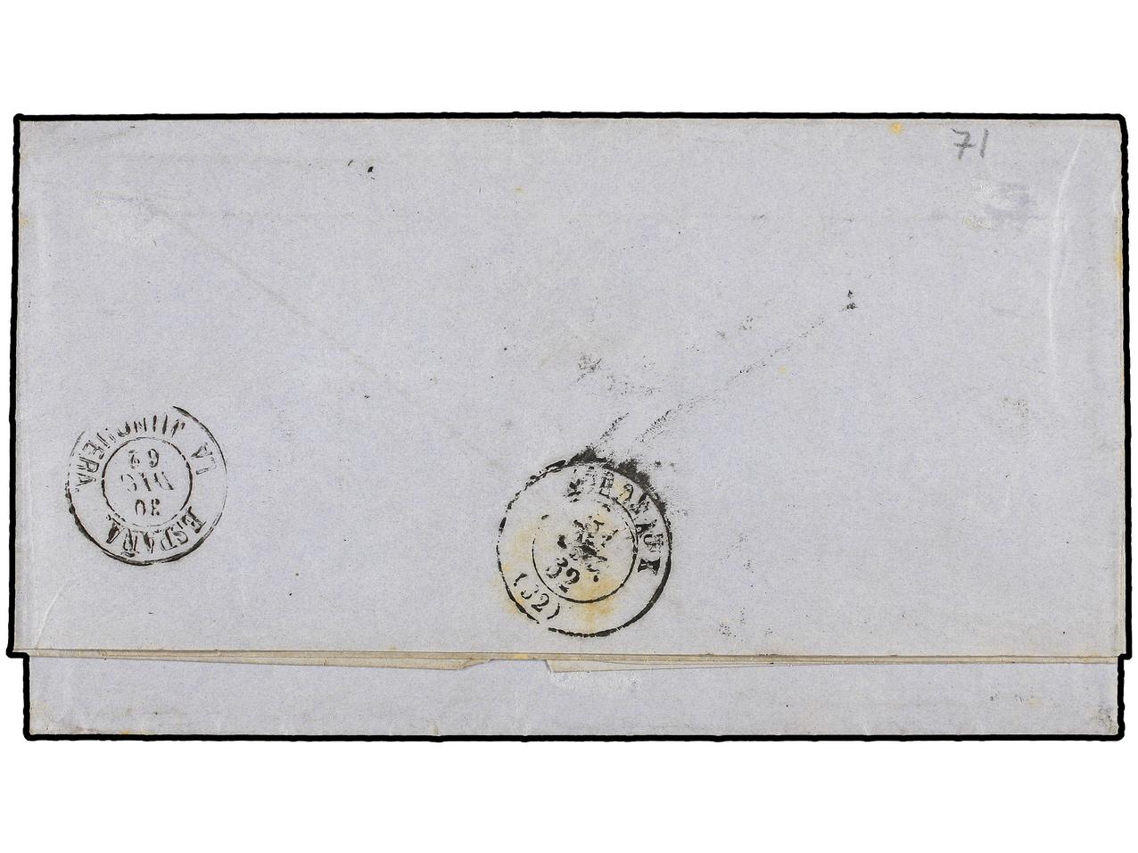 ESPAÑA. 1866. FRONTAL. BARCELONA a PARÍS. 12 cuartos naranja. FALSO POSTAL tipo II. Mat. parrilla con cifra ´2´, fechador de BARCELONA. (Graus 108 II). Frontal de carta solamente. Ed.82F. (Image1) (Image2)