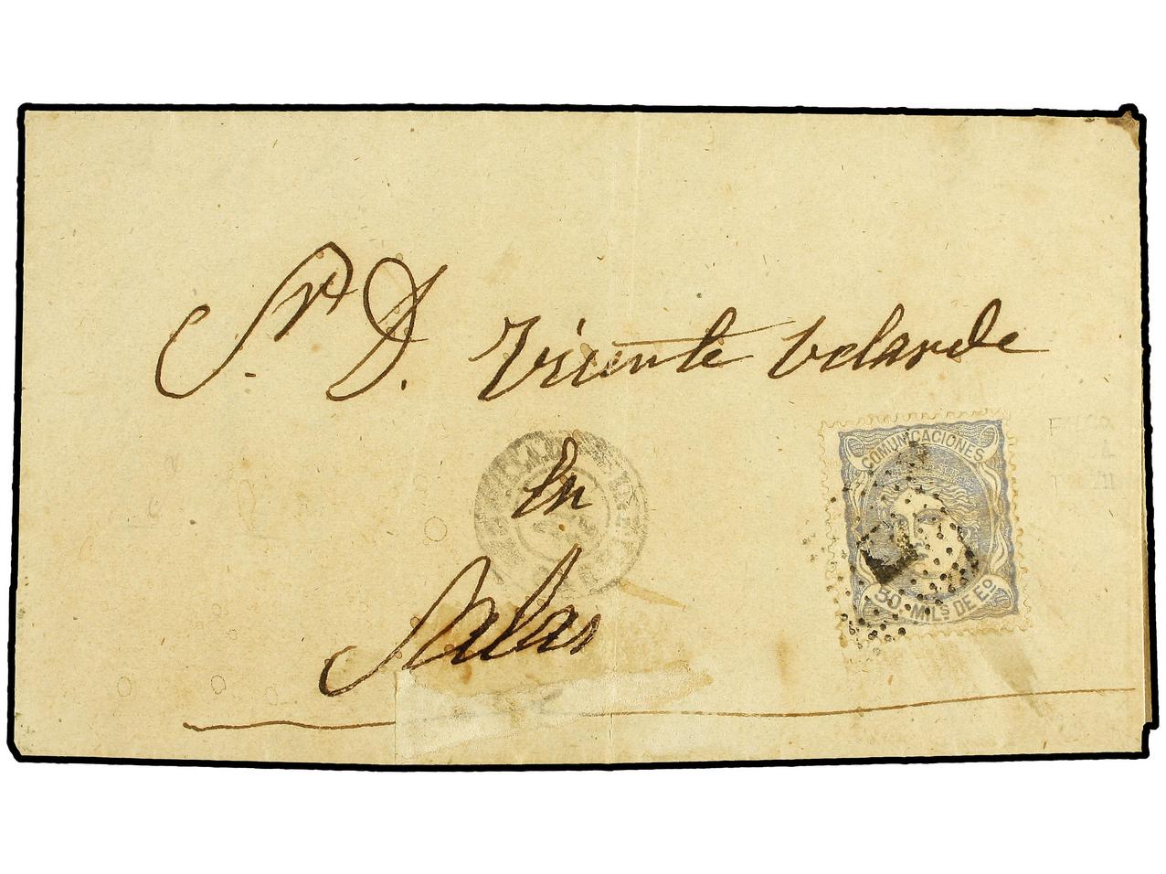 ESPAÑA. 1871. INFIESTO a SALAS. 50 mils. azul FALSO POSTAL Tipo VII. Muy raro usado en Asturias. Ed.107F. (Image1) (Image2)
