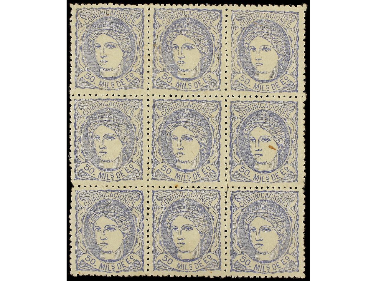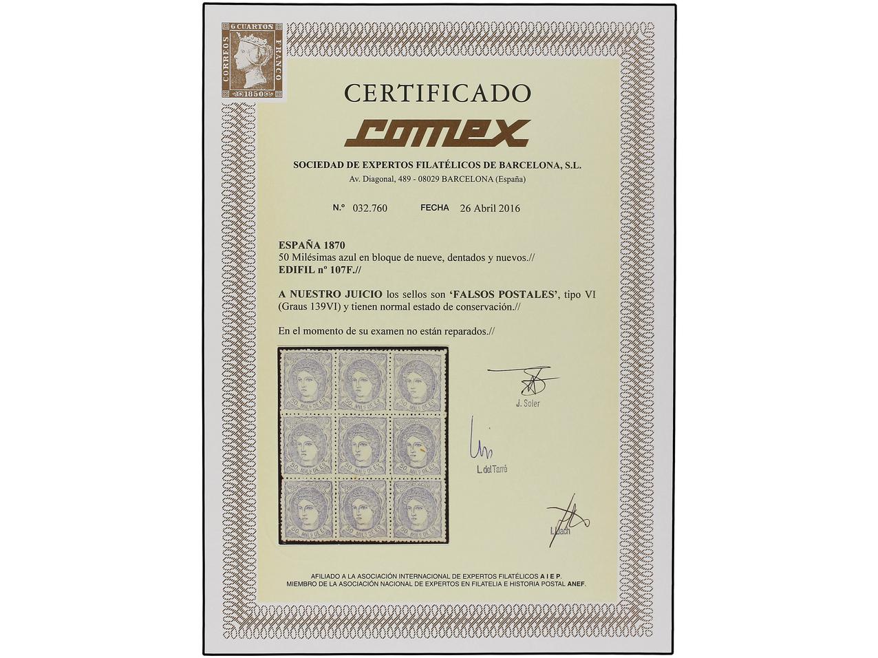 ESPAÑA. 50 mils. azul. FALSO POSTAL tipo VI. Bloque de nueve. RARÍSIMO en nuevo, hasta la aparición de este bloque nuevo solo se conocía un ejemplar. (Graus 139 VI). Cert. COMEX. Ed.107F. (Image1) (Image2)
