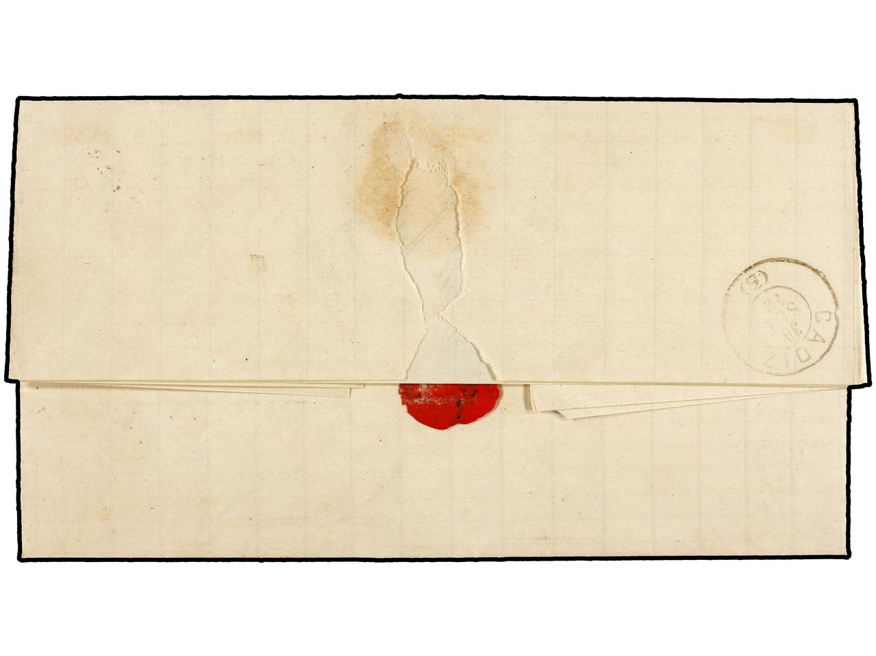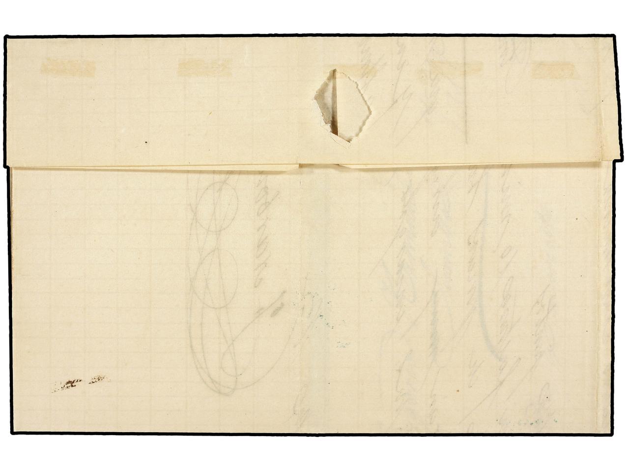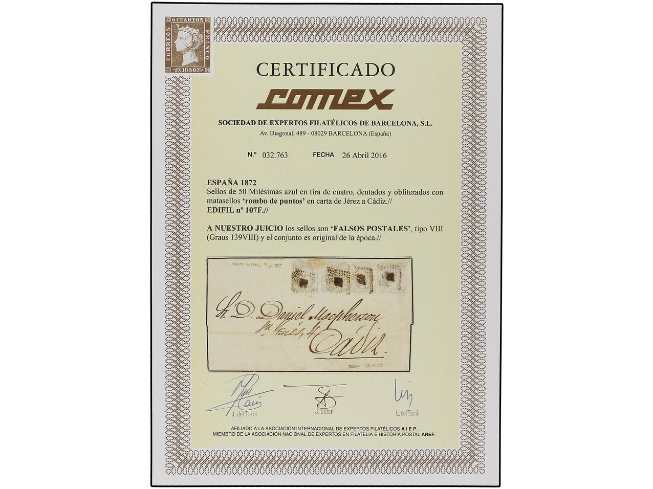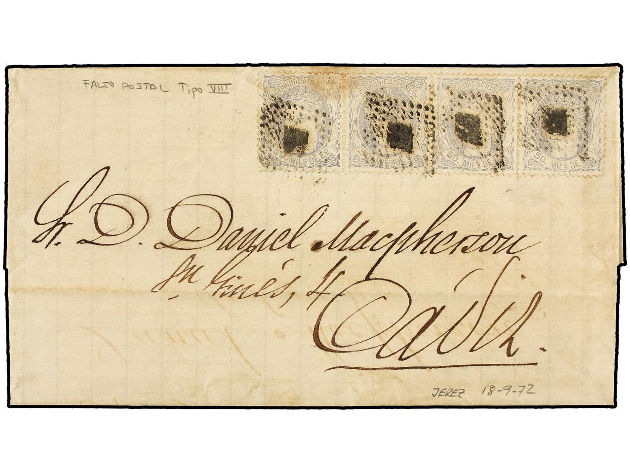 ESPAÑA. 1872. JEREZ a CÁDIZ. 50 mils. azul. FALSO POSTAL tipo VIII, tira de cuatro. Mat. rombo de puntos. EXCEPCIONAL FRANQUEO de cuatro portes (Graus 139 VIII). Cert. COMEX. Ed.107F. (Image1) (Image2)