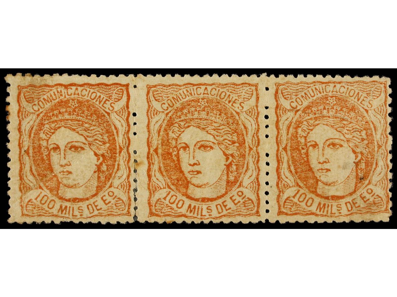 ESPAÑA. 100 mils. castaño rojo. FALSO POSTAL tipo I. Tira de tres, leve pliegue. RARO MÚLTIPLE (Graus 141 I). Ed.108F. (Image1)