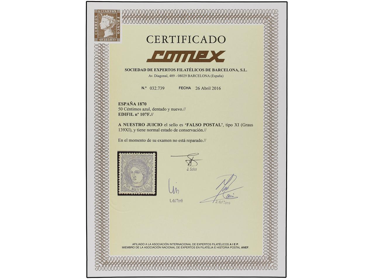 ESPAÑA. 50 mils. azul. FALSO POSTAL tipo XI. MUY RARO (Graus 139 XI). Cert. COMEX. Ed.107 F. (Image1) (Image2)