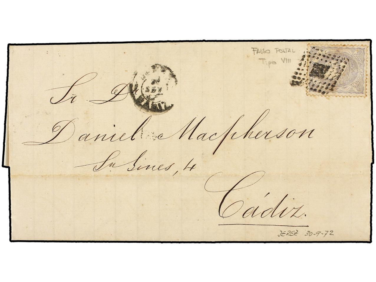 ESPAÑA. 1872. JEREZ a CÁDIZ.50 mils. azul. FALSO POSTAL tipo VIII. Mat. rombo de puntos y fechador de JEREZ (Graus 139 VIII). Ed.107F. (Image1) (Image2)