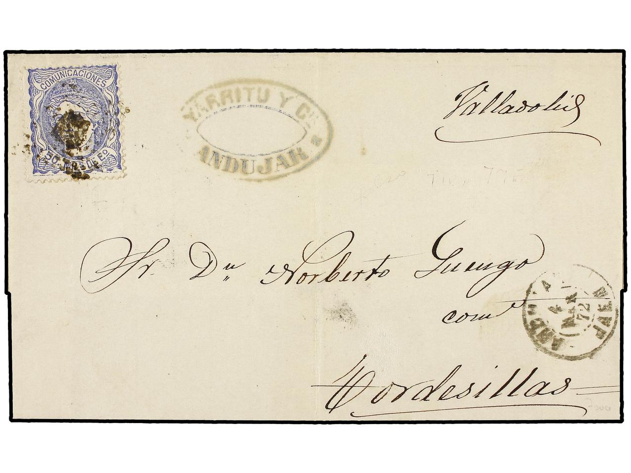 ESPAÑA. 1872. ANDÚJAR a TORDESILLAS. 50 mils. azul. FALSO POSTAL tipo V. Mat. rombo de puntos y fechador ANDUJAR/ JAEN. Ed.107F. (Image1) (Image2)