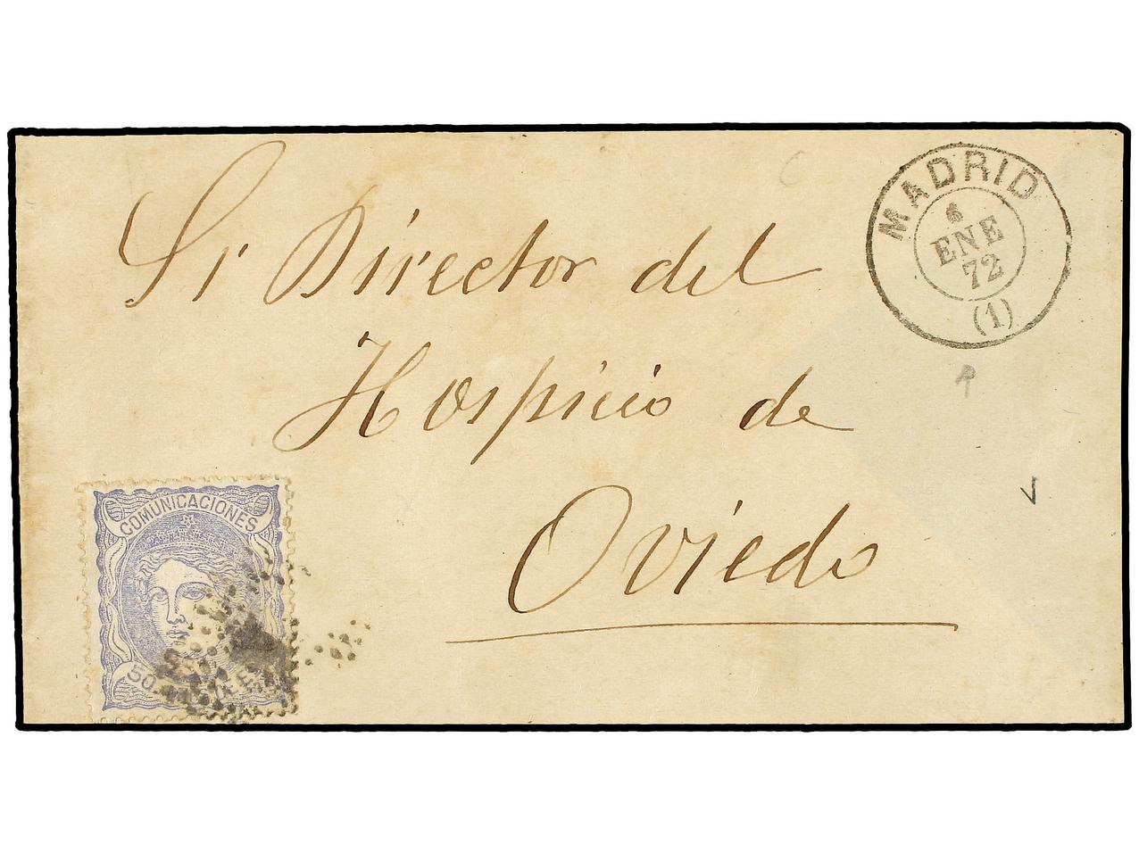 ESPAÑA. 1872. MADRID a OVIEDO. 50 mils. azul. FALSO POSTAL tipo V. Mat. rombo de puntos y fechador de MADRID. Ed.107F. (Image1) (Image2)