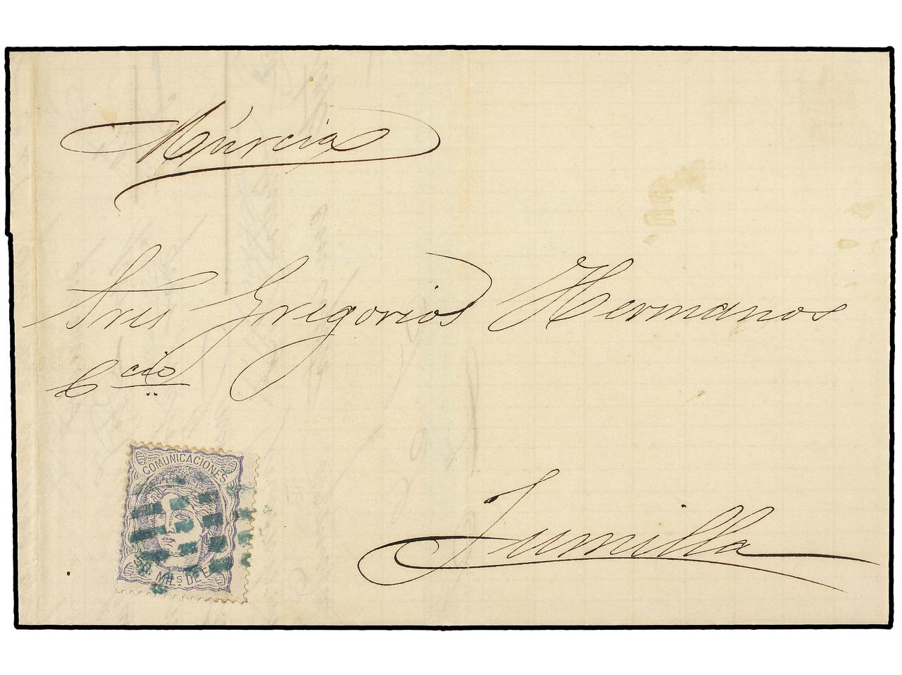 ESPAÑA. 1871. VALENCIA a JUMILLA. 50 mils. azul. FALSO POSTAL tipo V. Mat. barras cortadas de Valencia en azul. Ed.107F. (Image1) (Image2)