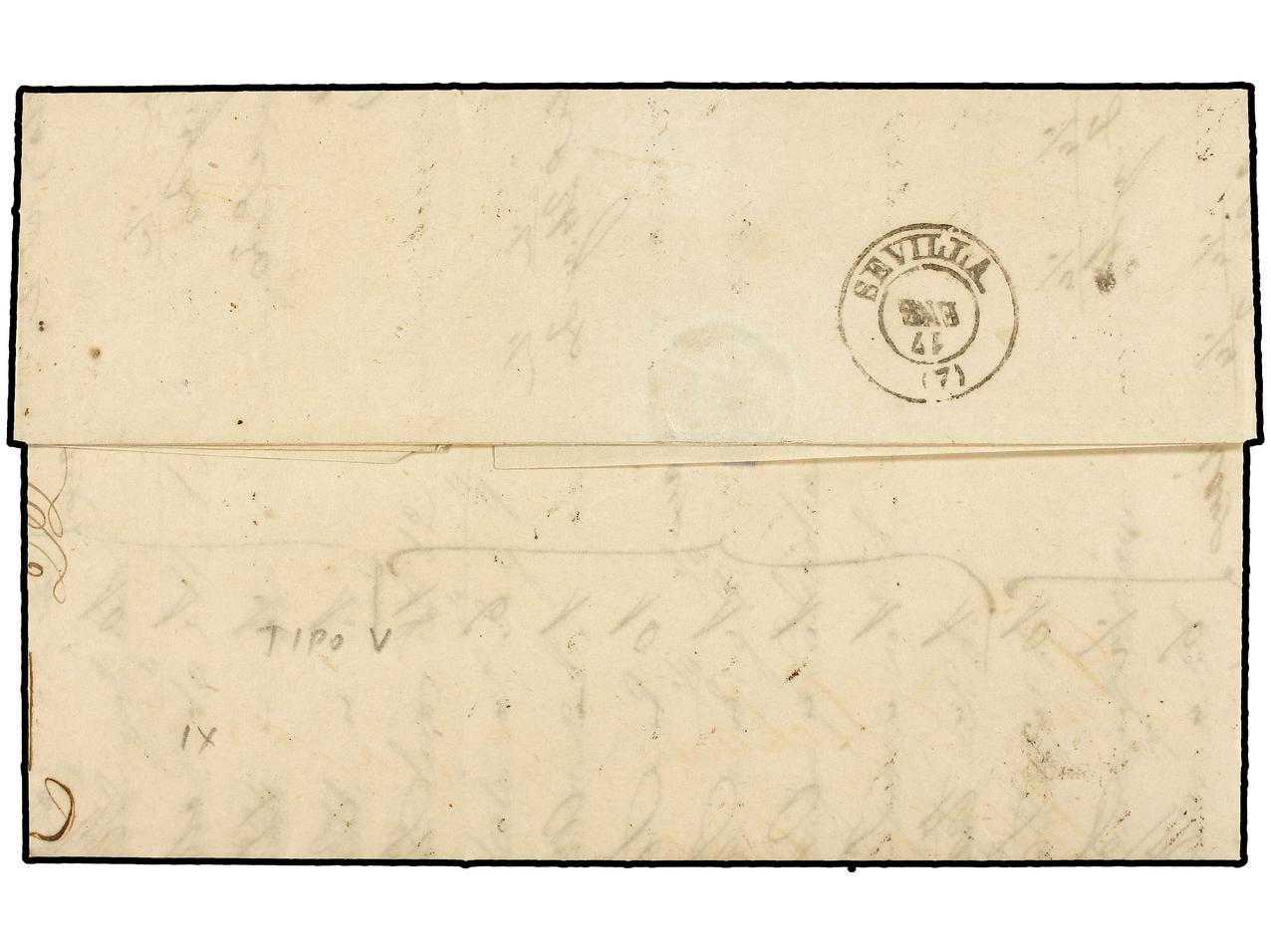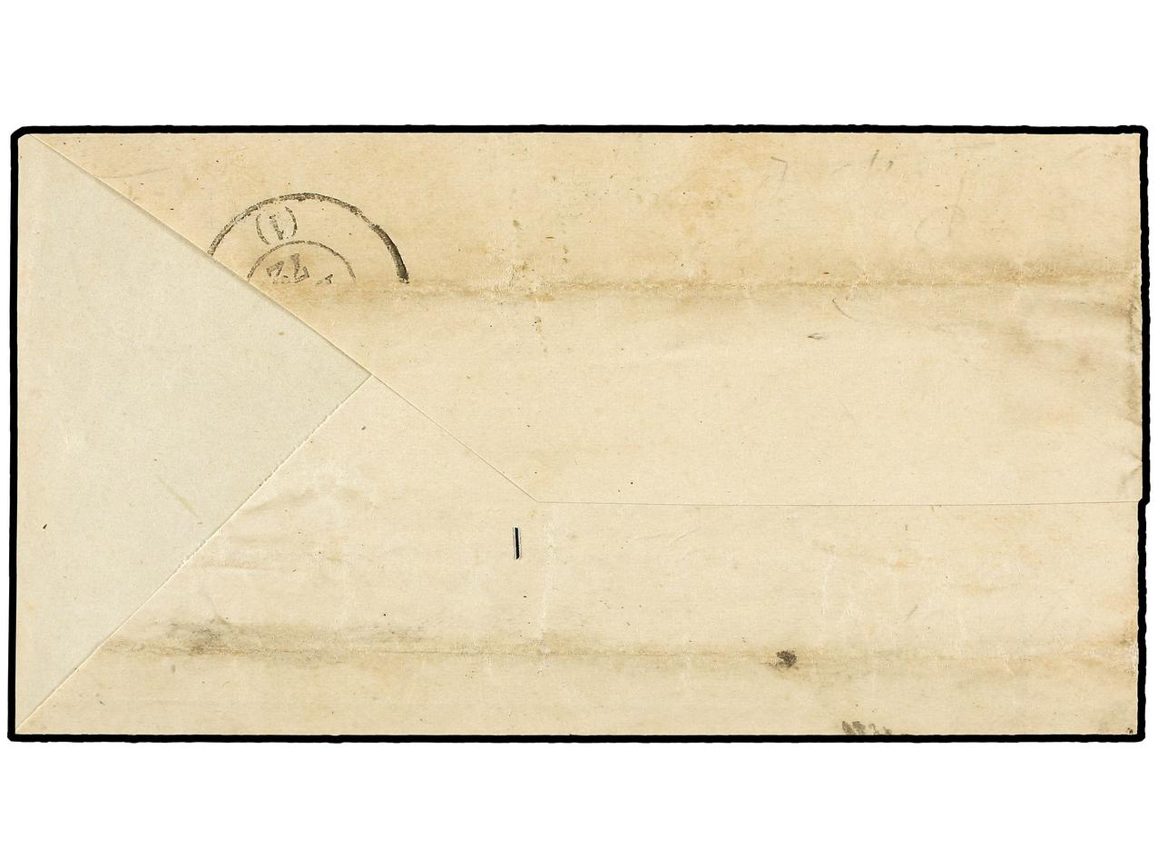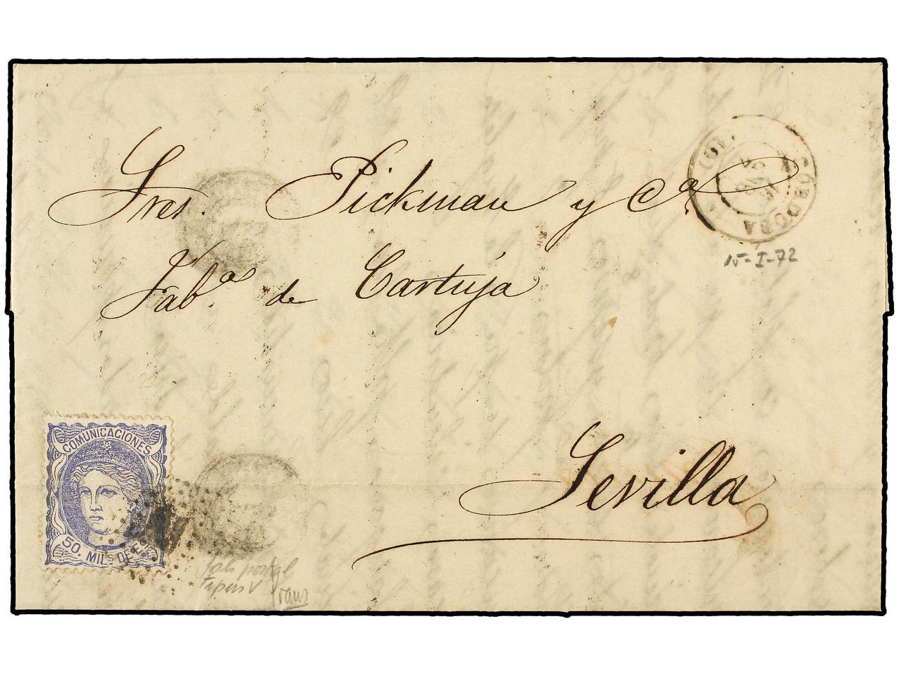 ESPAÑA. 1872. CÓRDOBA a SEVILLA. 50 mils. azul. FALSO POSTAL tipo V. Mat. rombo de puntos y fechador de CÓRDOBA. F. Graus. Ed.107F. (Image1) (Image2)
