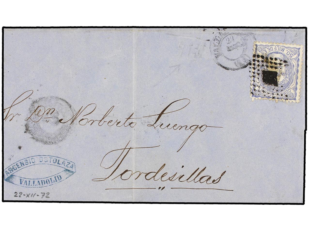 ESPAÑA. 1872. VALLADOLID a TORDESILLAS. 50 mils. azul. FALSO POSTAL tipo V. Mat. rombo de puntos y fechador de VALLADOLID. Ed.107F. (Image1) (Image2)