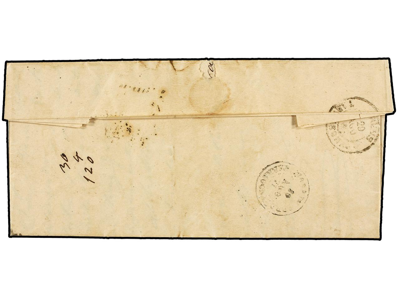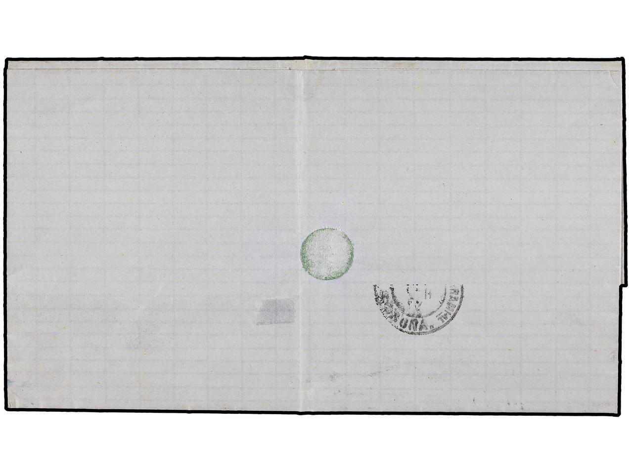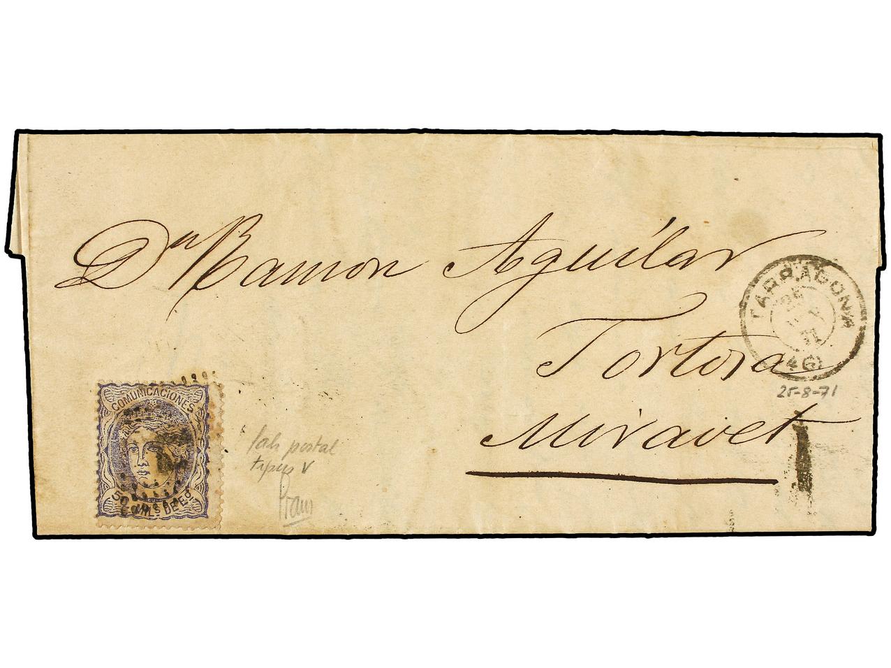 ESPAÑA. 1871. TARRAGONA a TORTOSA. 50 mils. azul. FALSO POSTAL tipo V. Mat. rombo de puntos y fechador de TARRAGONA. F. Graus. Ed.107F. (Image1) (Image2)
