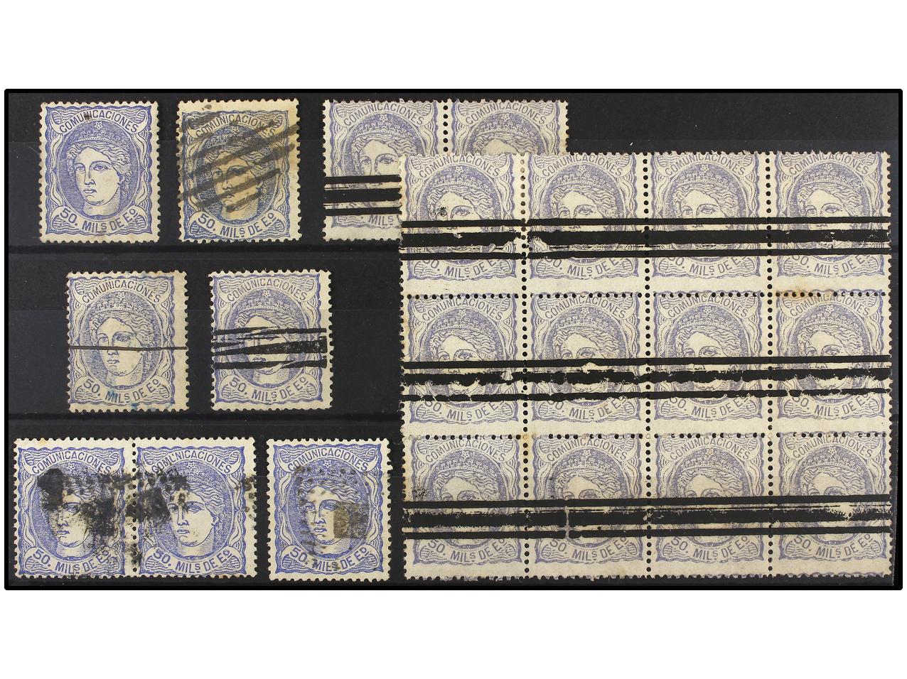 ESPAÑA. 50 mils. azul. FALSO POSTAL tipo V. 5 sellos usados, y 16 barrados (incluyendo un bloque de 12). Ed.107F (21). (Image1)