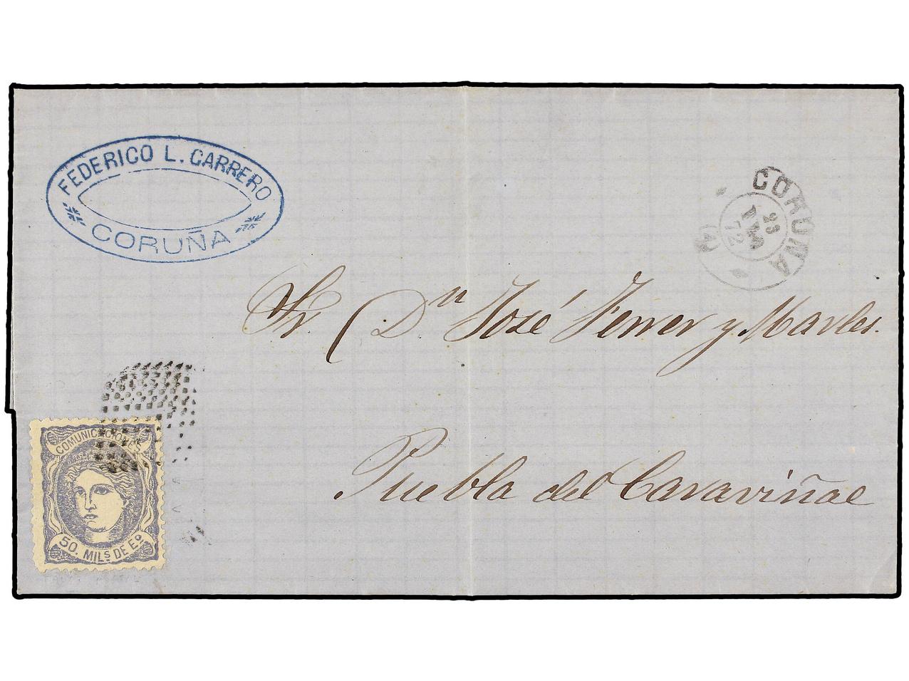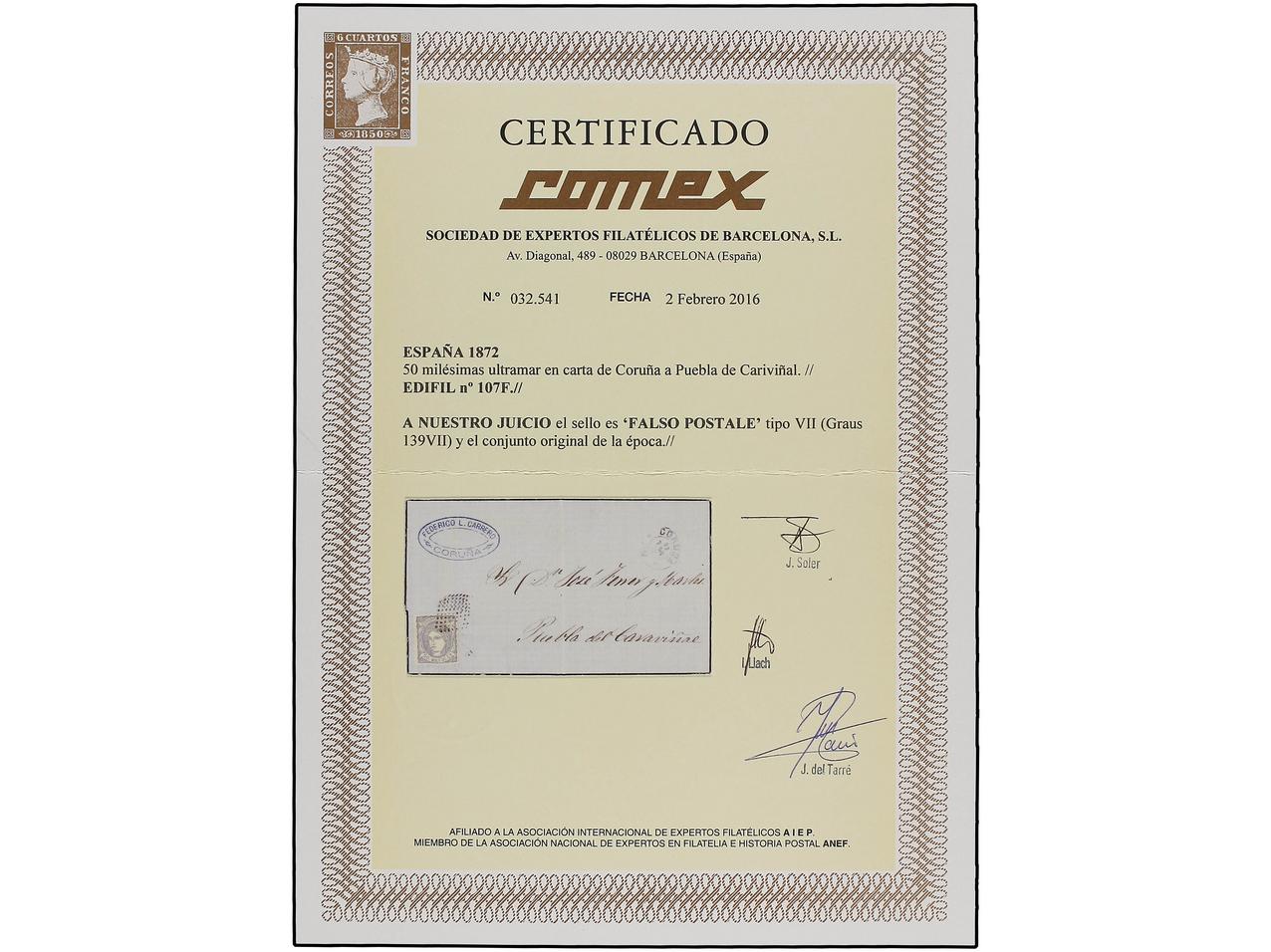 ESPAÑA. 1872. CORUÑA a PUEBLA DE CARABIÑAL. 50 mils. azul. FALSO POSTAL tipo VII. RARÍSIMO usado en Galicia. (Graus 139 VII). Cert. COMEX. Ed.107F.