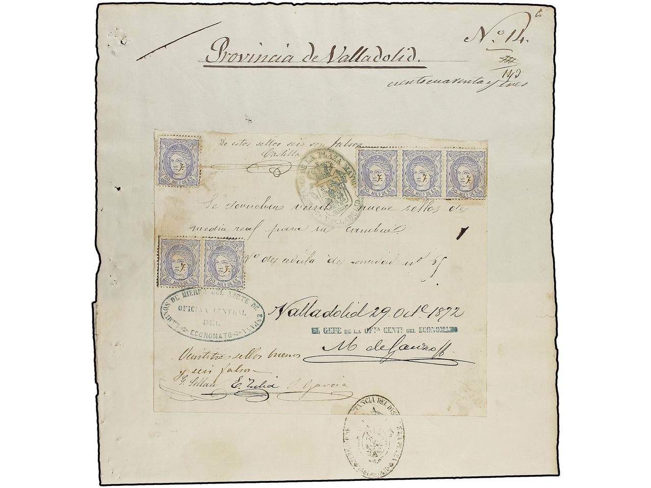 ESPAÑA. 50 mils. azul. FALSO POSTAL tipo VIII. DOCUMENTO DE INTERVENCION fechado en VALLADOLID con seis sellos adheridos ´F´ de falso manuscrita y firmas de los grabadores G. Sellan, E. Julia, J. Garcia. MUY INTERESANTE. (Graus 139 VIII).