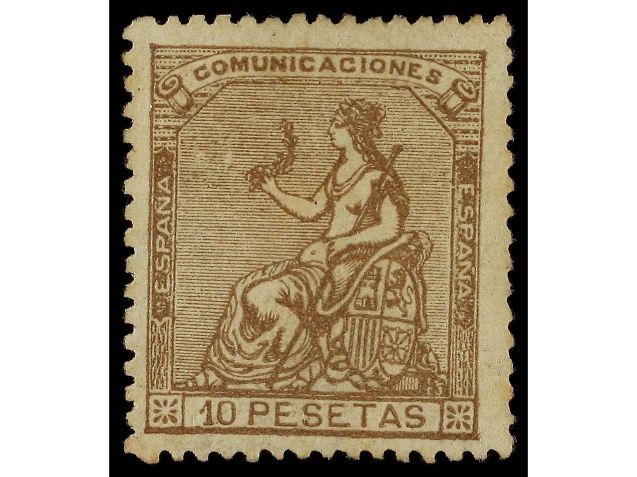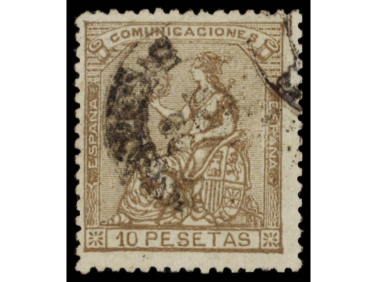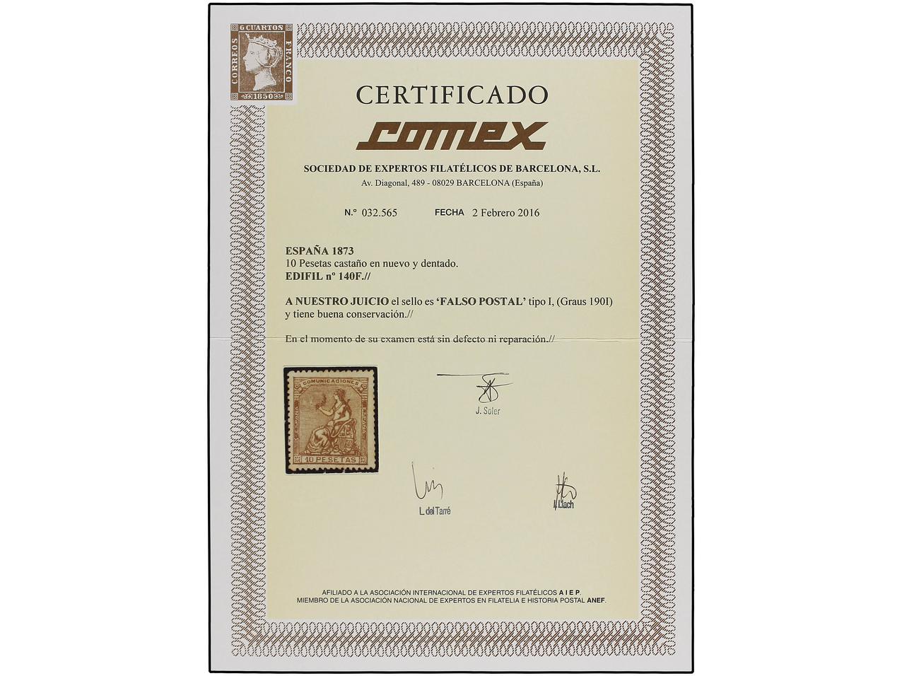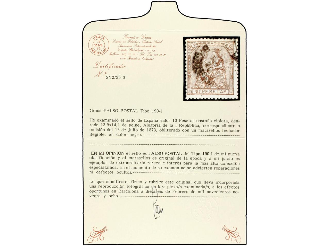 ESPAÑA. 10 pesetas castaño. FALSO POSTAL. Tipo I. Mat. fechador. Rarísimo en usado. Ex. col. Graus. Cert. GRAUS. Ed.140F. (Image1) (Image2)