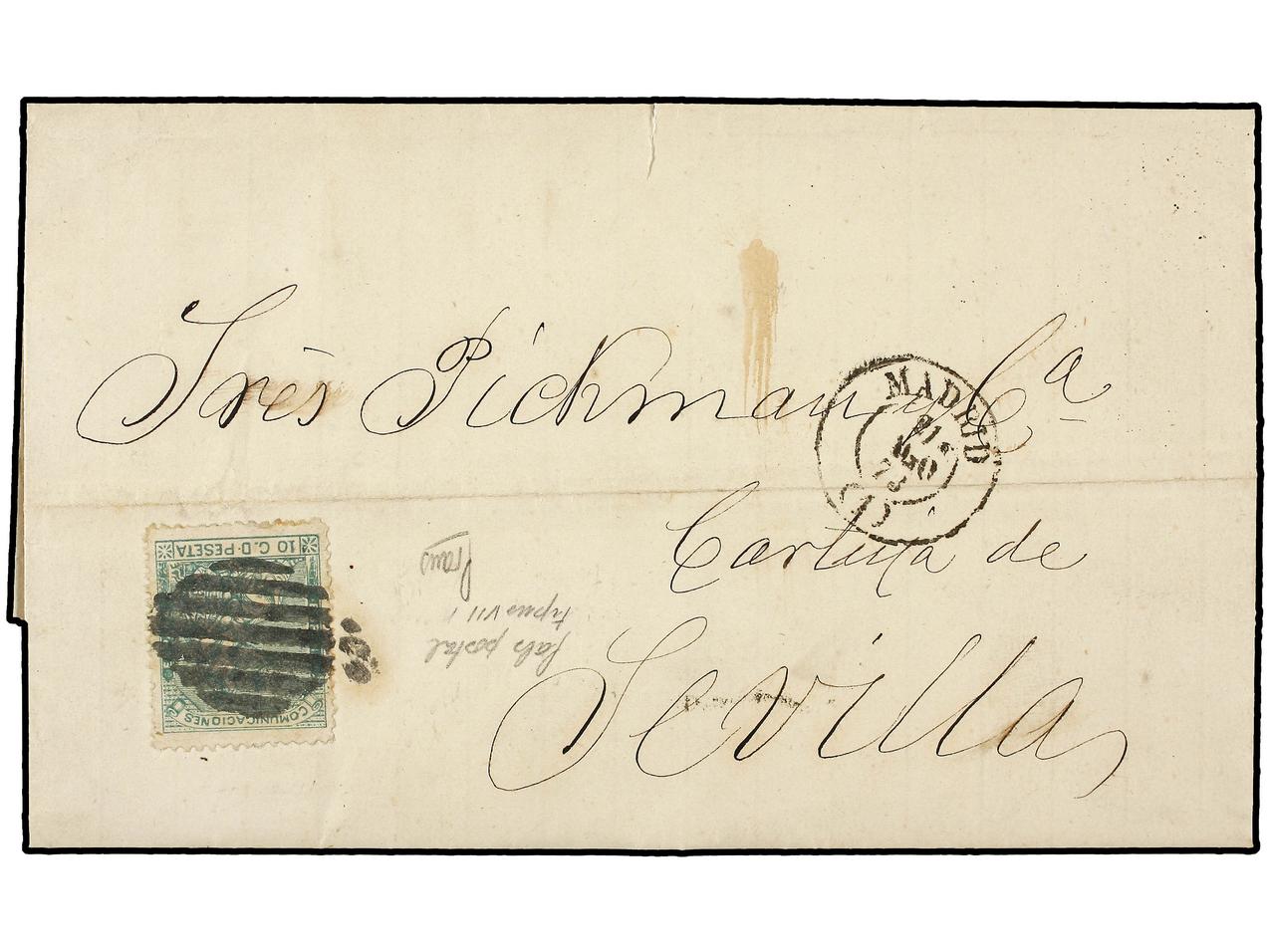 ESPAÑA. 1873. MADRID a SEVILLA. 10 cts. verde FALSO POSTAL tipo VII. RARÍSIMO en carta. Ex colección GRAUS (Graus 182 VII). F. GRAUS. Ed.133 F.