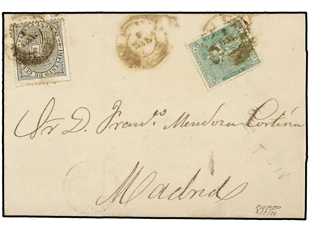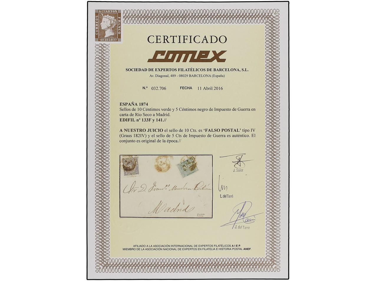 ESPAÑA. 1874. RÍO SECO a MADRID. 10 cts. verde FALSO POSTAL tipo IV y sello auténtico de 5 cts. negro de Impuesto de Guerra. RARÍSIMO en carta (Graus 182 IV). Cert. COMEX. Ed.133 F. (Image1) (Image2)