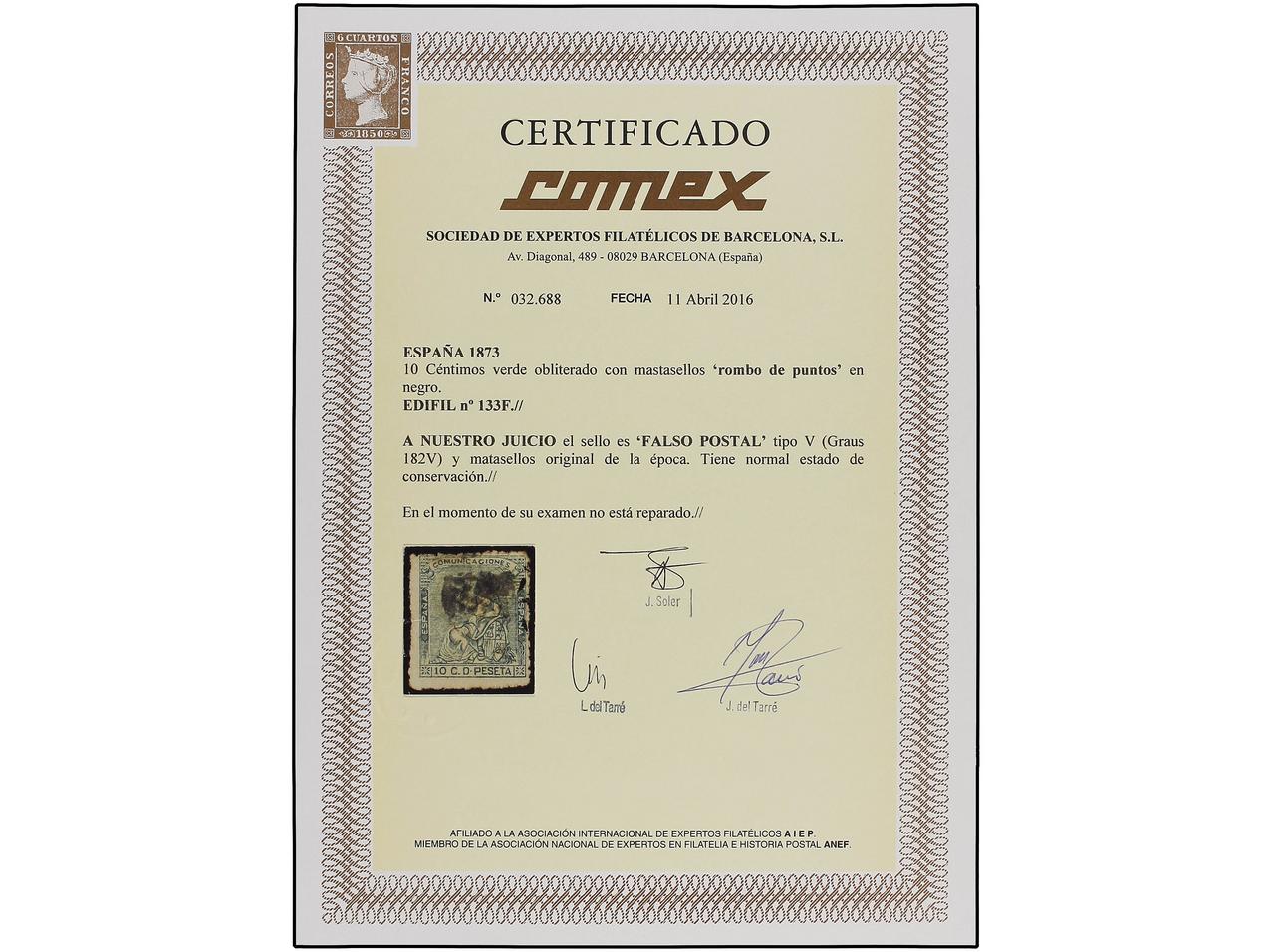 ESPAÑA. 10 cent. verde. FALSO POSTAL tipo IX. Mat. rombo de puntos. RARÍSIMO, en la colección de F. Graus no había ningún ejemplar. (Graus 182 IX). F. E. Soro. Cert. COMEX. Ed.133F. (Image1) (Image2)
