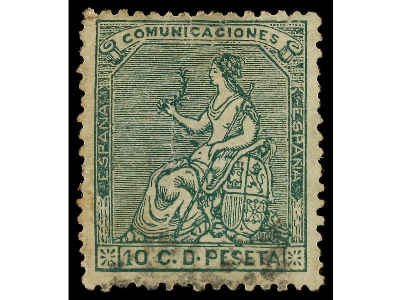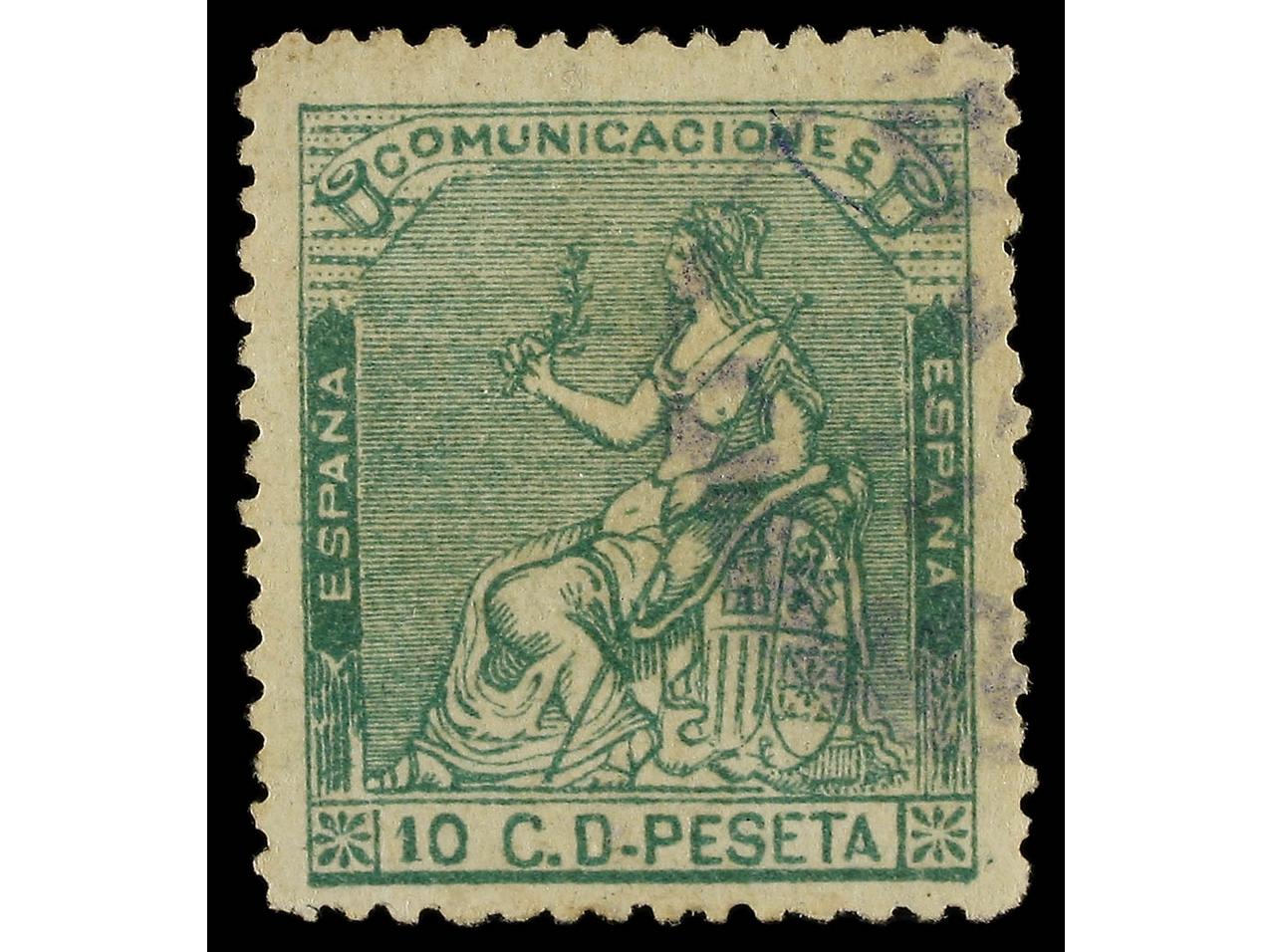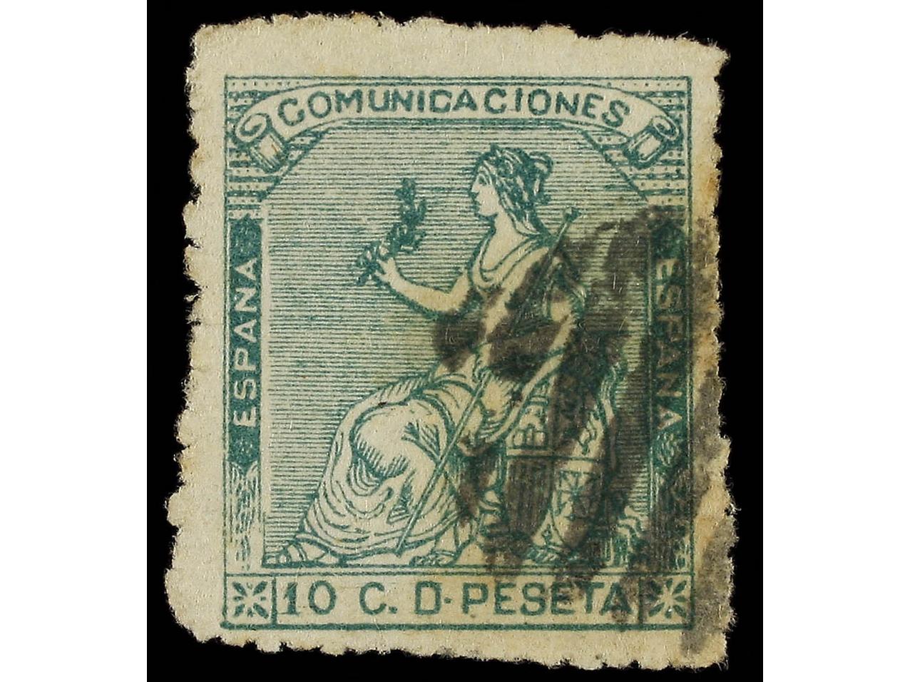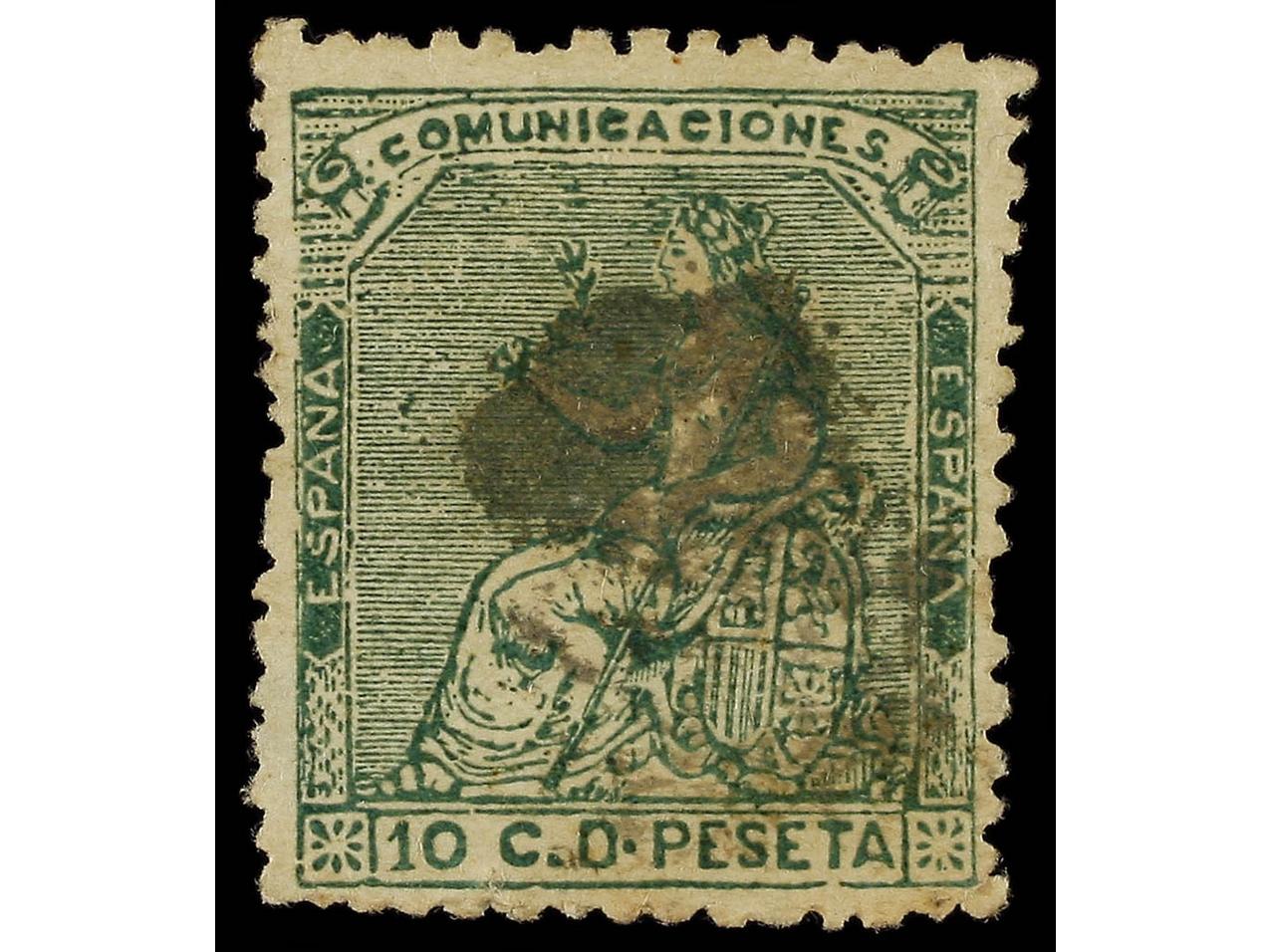 ESPAÑA. 10 cent. verde FALSO POSTAL tipo VIII. Extraordinariamente RARO, probablemente se trate del único ejemplar conocido. Ex colección GRAUS (Graus 182 VIII). Cert. COMEX. Ed.133F. (Image1) (Image2)