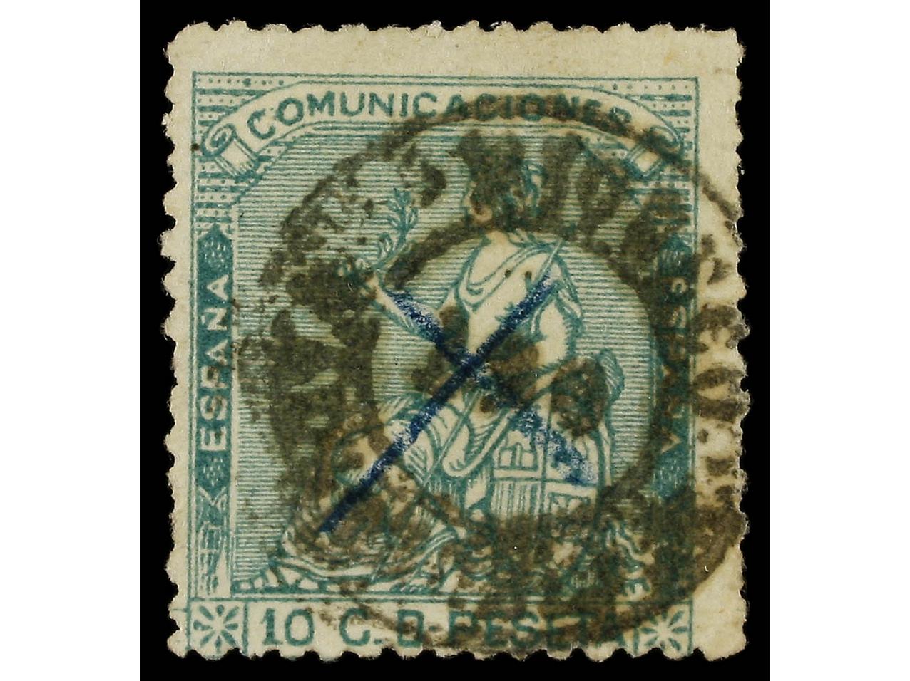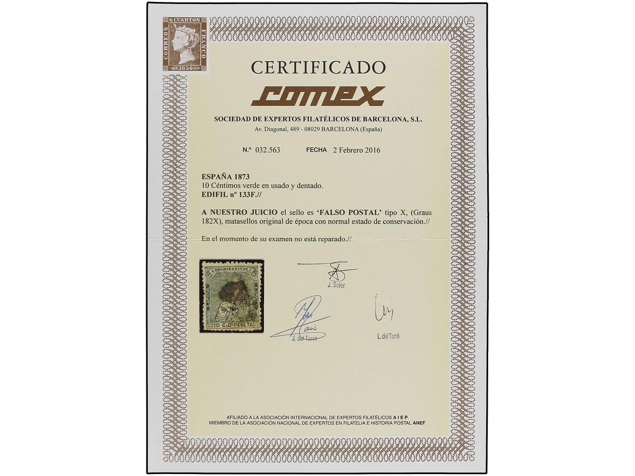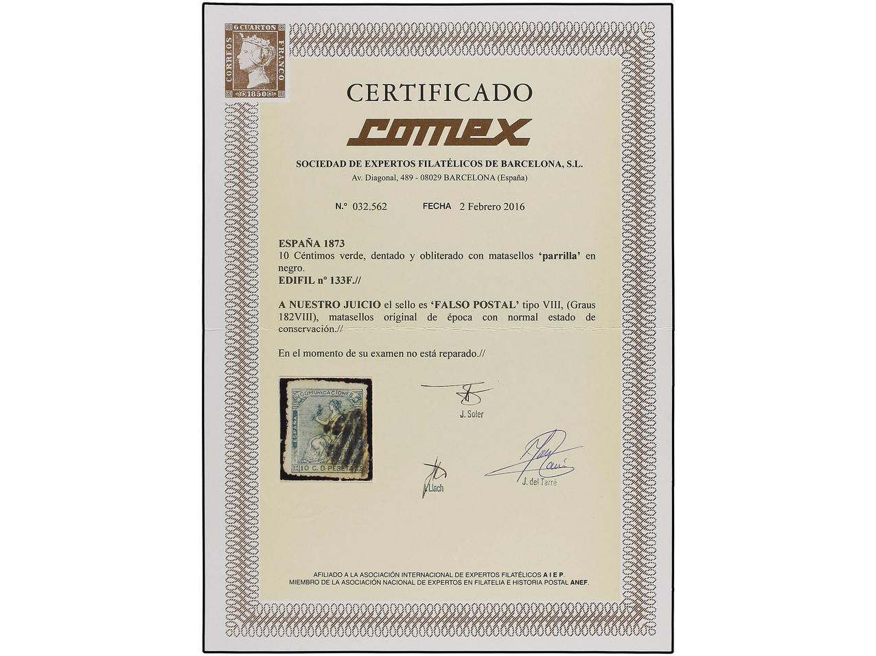 ESPAÑA. 10 cent. verde FALSO POSTAL tipo X. Extraordinariamente RARO, en la colección de F. GRAUS no había ningún ejemplar de este tipo (Graus 182X). Cert. COMEX. Ed.133F. (Image1) (Image2)