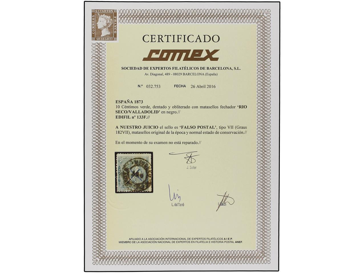 ESPAÑA. 10 cent. verde. FALSO POTAL tipo VIII. Mat. fechador RIO SECO/ VALLADOLID. RARÍSIMO, único conocido usado en esta localidad. (Graus 182 VII). Cert. COMEX. Ed.133F. (Image1) (Image2)