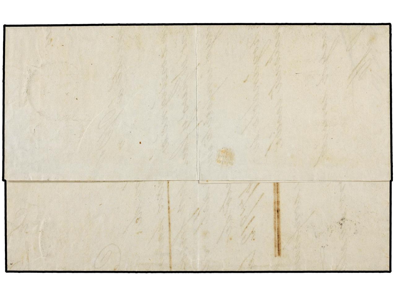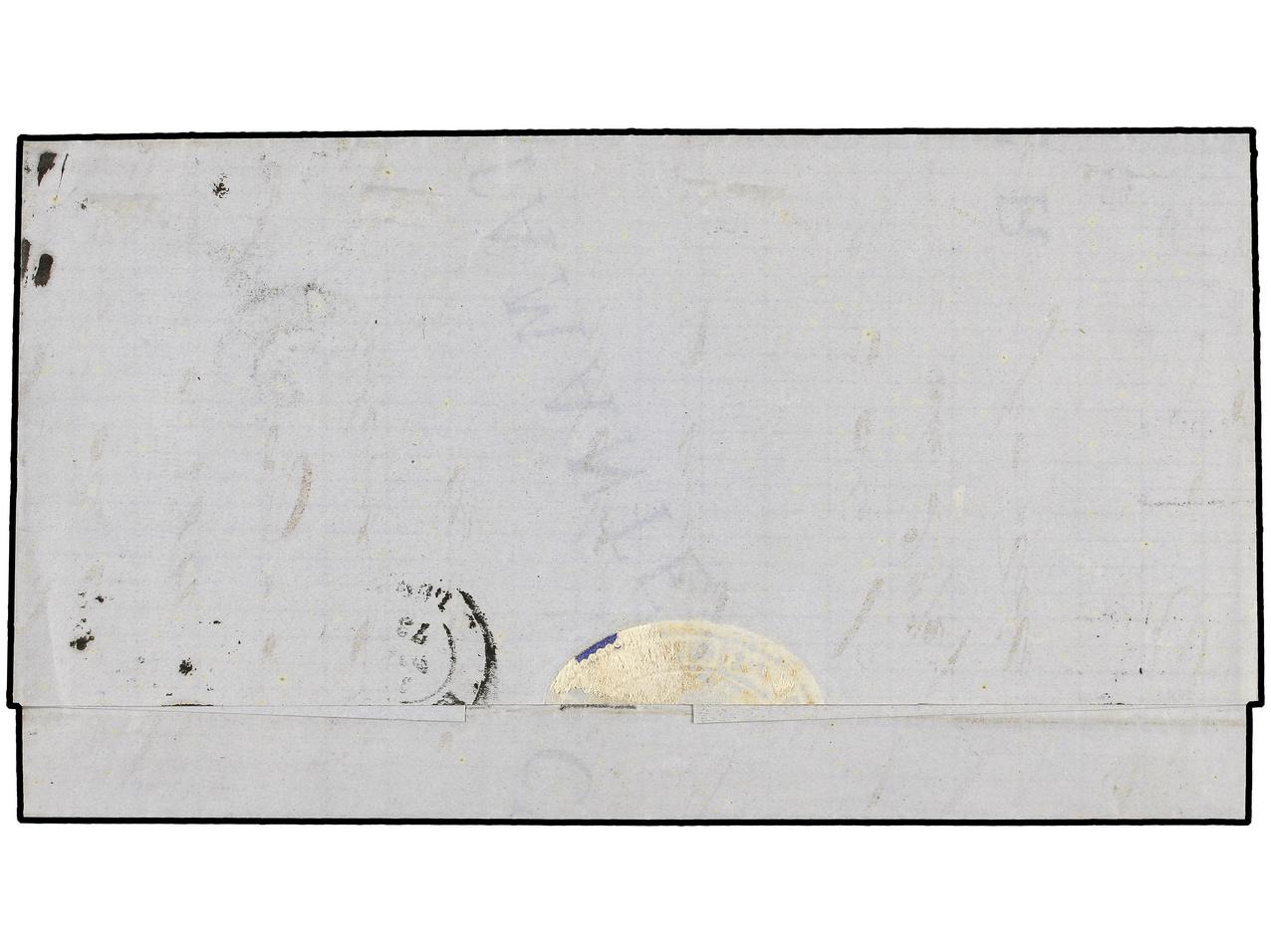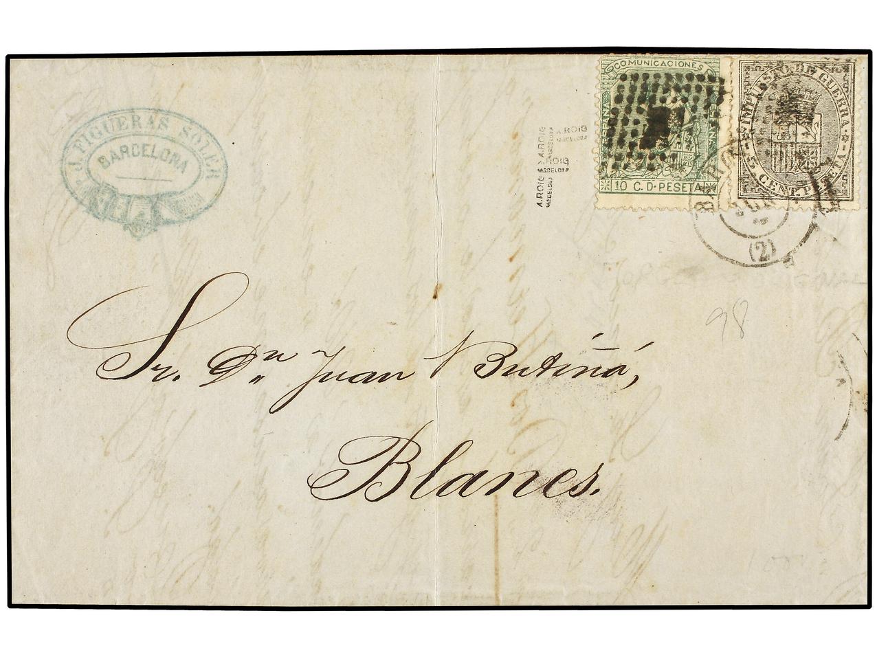 ESPAÑA. 1874. BARCELONA A BLANES. 10 cent. verde. FALSO POSTAL tipo III y sello de Imp. de Guerra de 5 cts. negro. Mat. rombo de puntos y fechador de BARCELONA. RARO EN CARTA. (Graus 182 III). F. Roig. Ed.133F, 141. (Image1) (Image2)