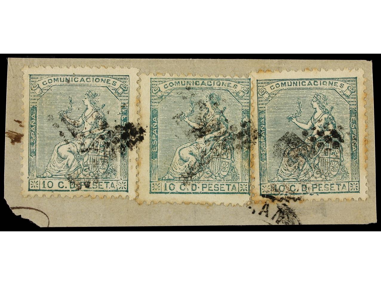 ESPAÑA. 10 cent. verde. FALSO POSTAL tipo XII. 3 sellos sobre fragmentos. Mat. parrilla y fechador de SANTANDER. (Graus 182 XII). Ed.133F (3).