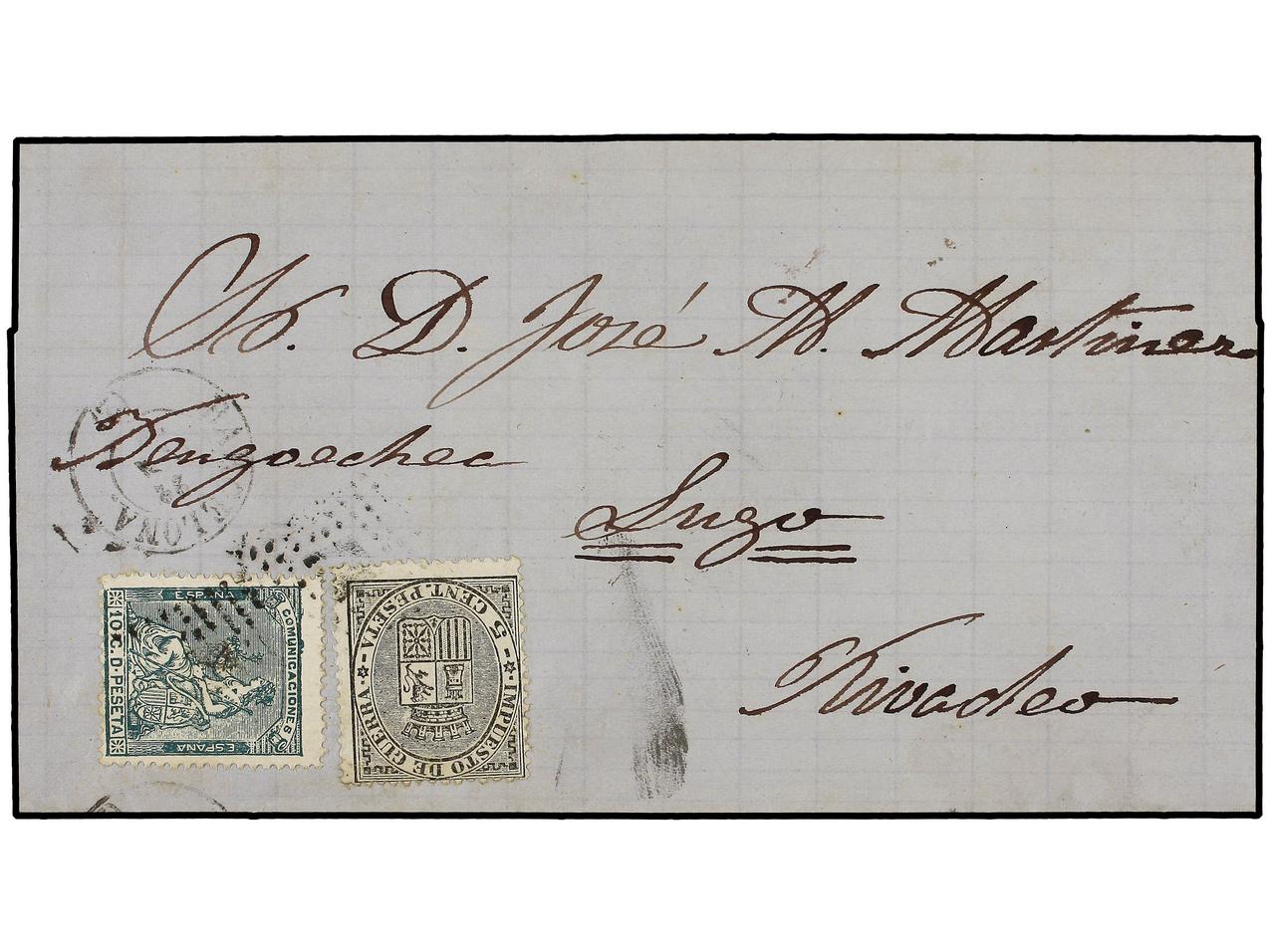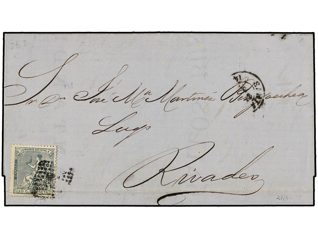 ESPAÑA. 1874. BARCELONA a RIVADEO. 10 cent. verde. FALSO POSTAL tipo XII y sello de Imp. de Guerra de 5 cts. negro. Mat. parrilla y fechador de BARCELONA.(Graus 182 XII). Ed.133F, 141. (Image1) (Image2)