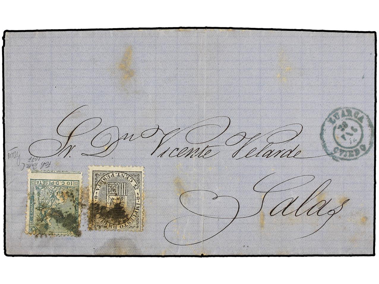 ESPAÑA. 1874. LUARCA a SALAS. 10 cts. verde. FALSO POSTAL tipo XII y sello de Imp. de Guerra de 5 cts. negro. Mat. rombo de puntas y fechador LUARCA/ OVIEDO. MUY RARO usado en esta población (Graus 182 XII). F. Graus. Ed.133F, 141. (Image1) (Image2)