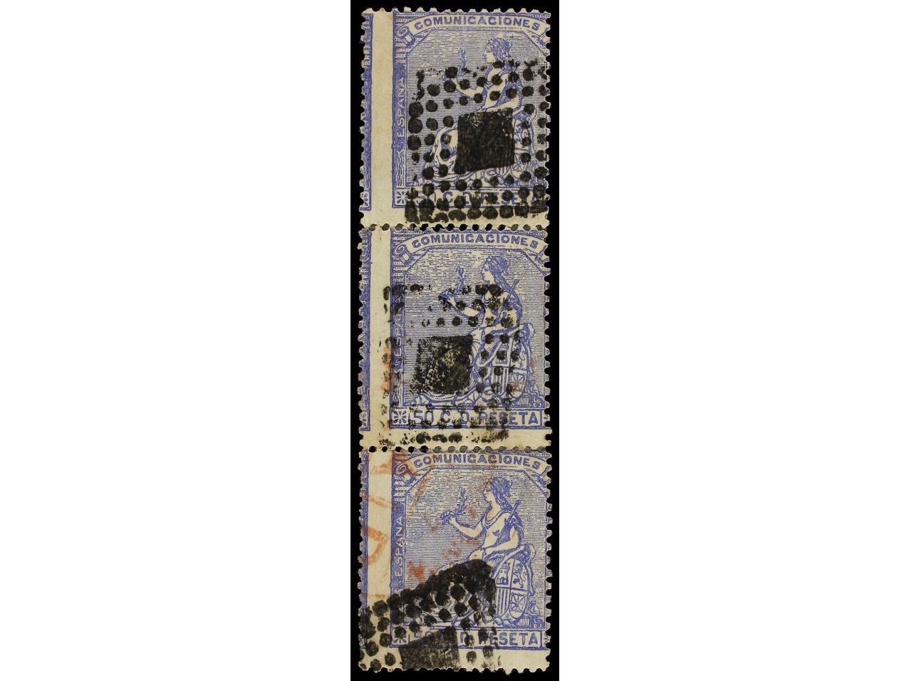 ESPAÑA. 50 cent. azul. FALSO POSTAL. Tira vertical de tres (reforzada). Mat. rombo de puntos y LONDON/PAID en rojo. RARO sello en usado, en múltiple es el único conocido (Graus 187 I). Ed.137F (3). (Image1)