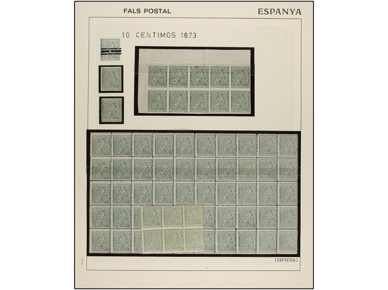 ESPAÑA. 10 cent. verde. FALSO POSTAL tipo XI. Sello en nuevo más B-4 más B-50, sin dentar sello y B-10 y un sello barrado. (Graus 182 XI). Ed.133F.