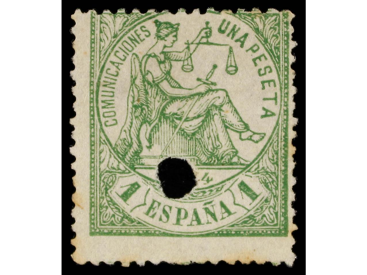 ESPAÑA. 1 pta. verde (Gr. 208 tipo III). Taladrado. F. Soro. Ed.150F. (Image1)