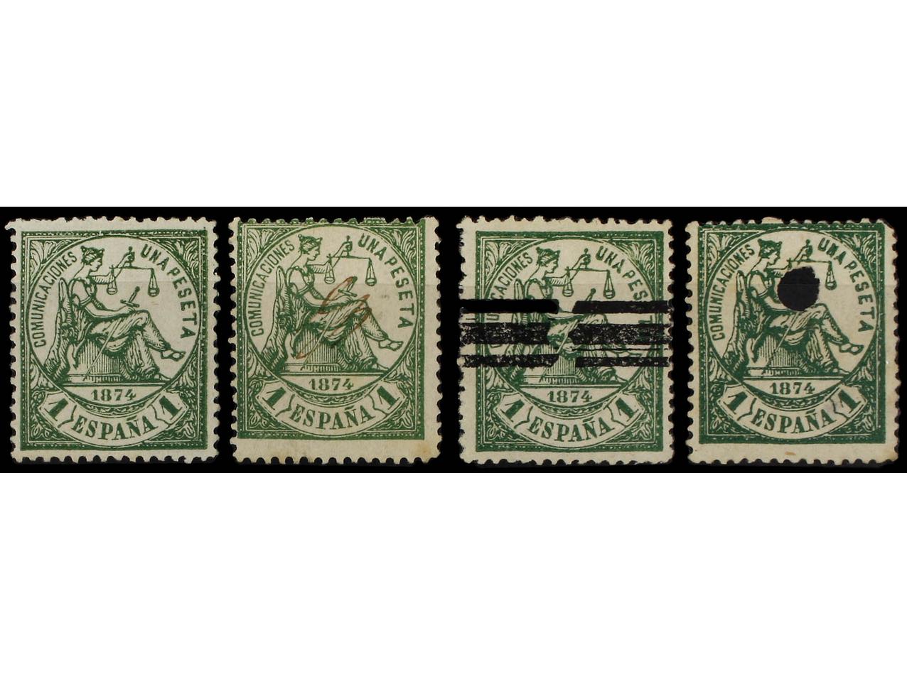 ESPAÑA. 1 pta. verde. FALSO POSTAL. Tipo III.4 sellos, nuevo, F manuscrita, barrado y taladrado. Ed.150F. (Image1)