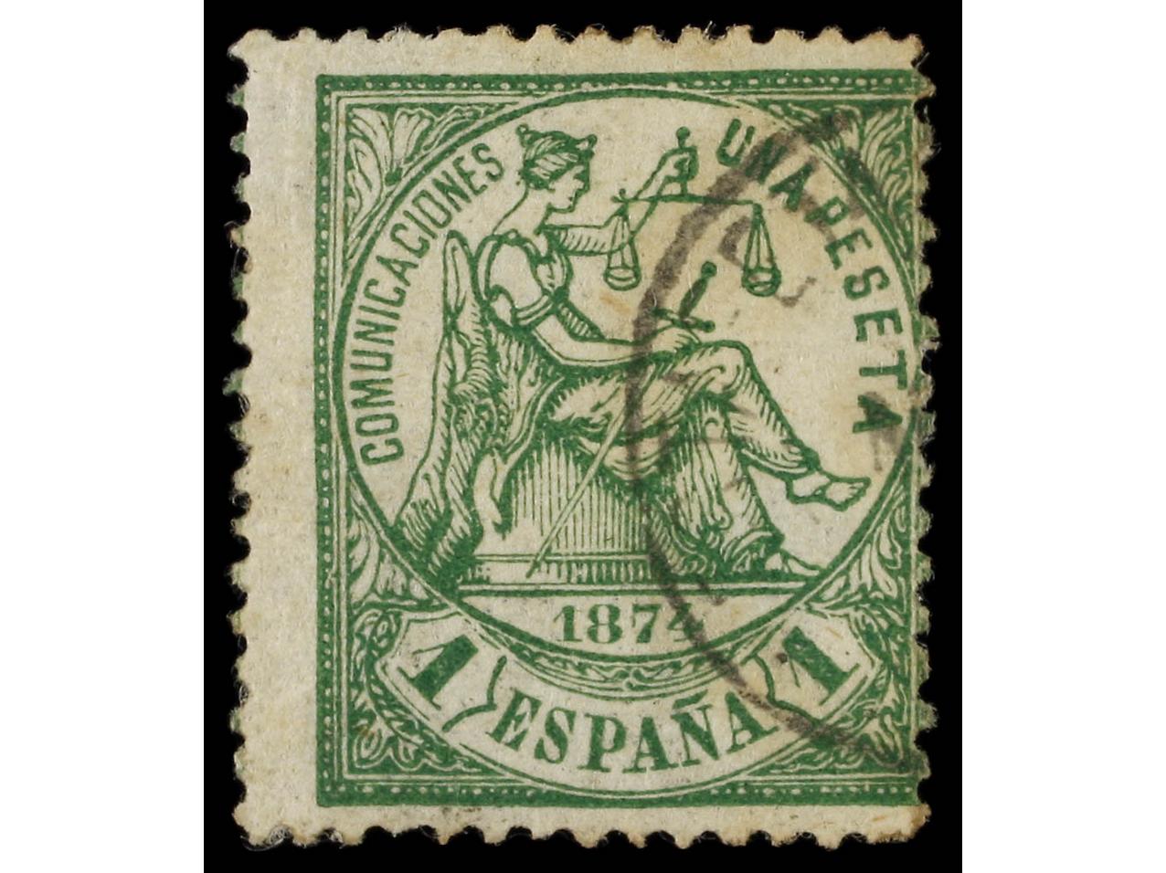 ESPAÑA. 1 pta. verde (Gr. 208 tipo III). Barrado. F. Soro. Ed.150F. (Image1)