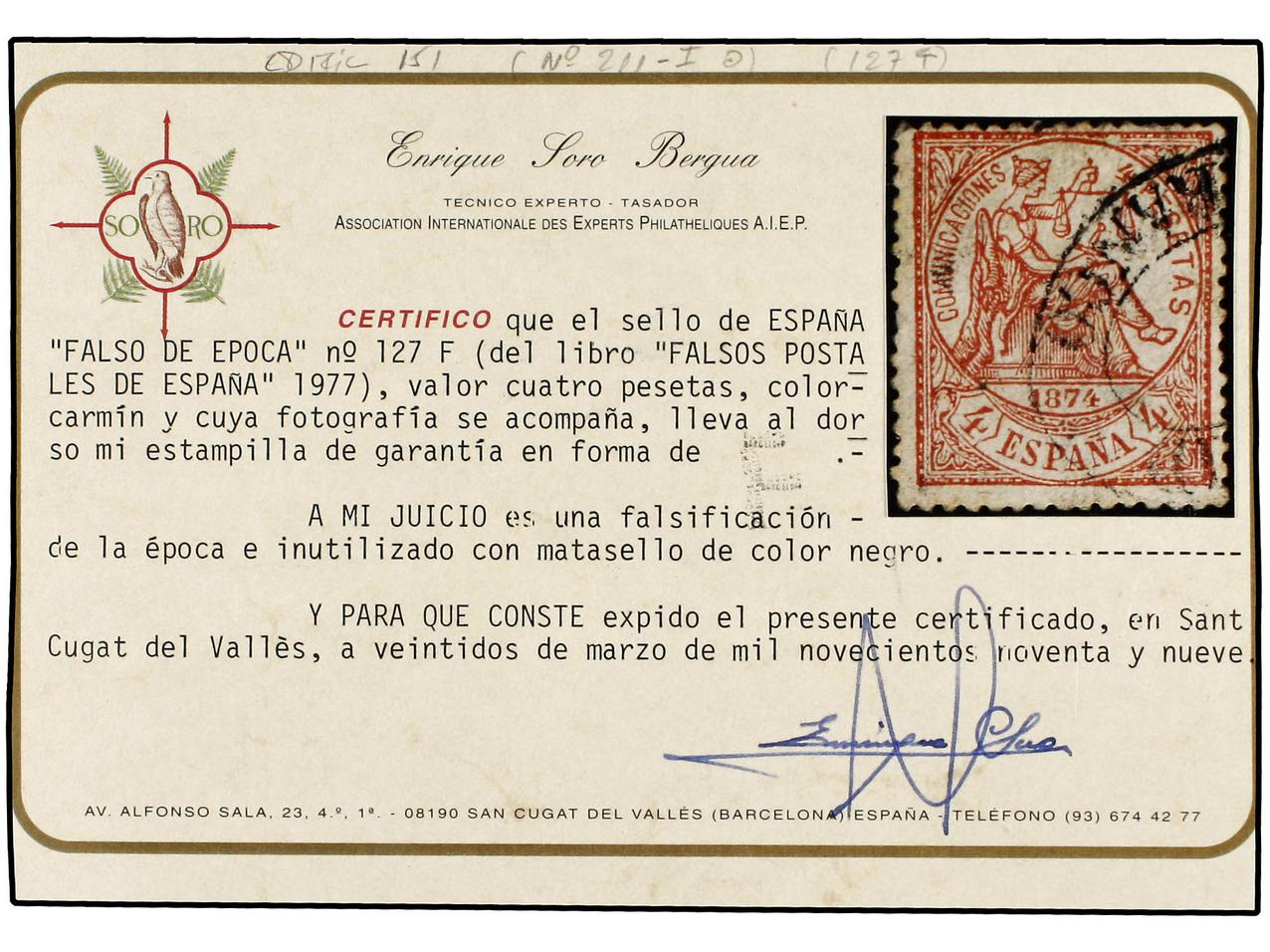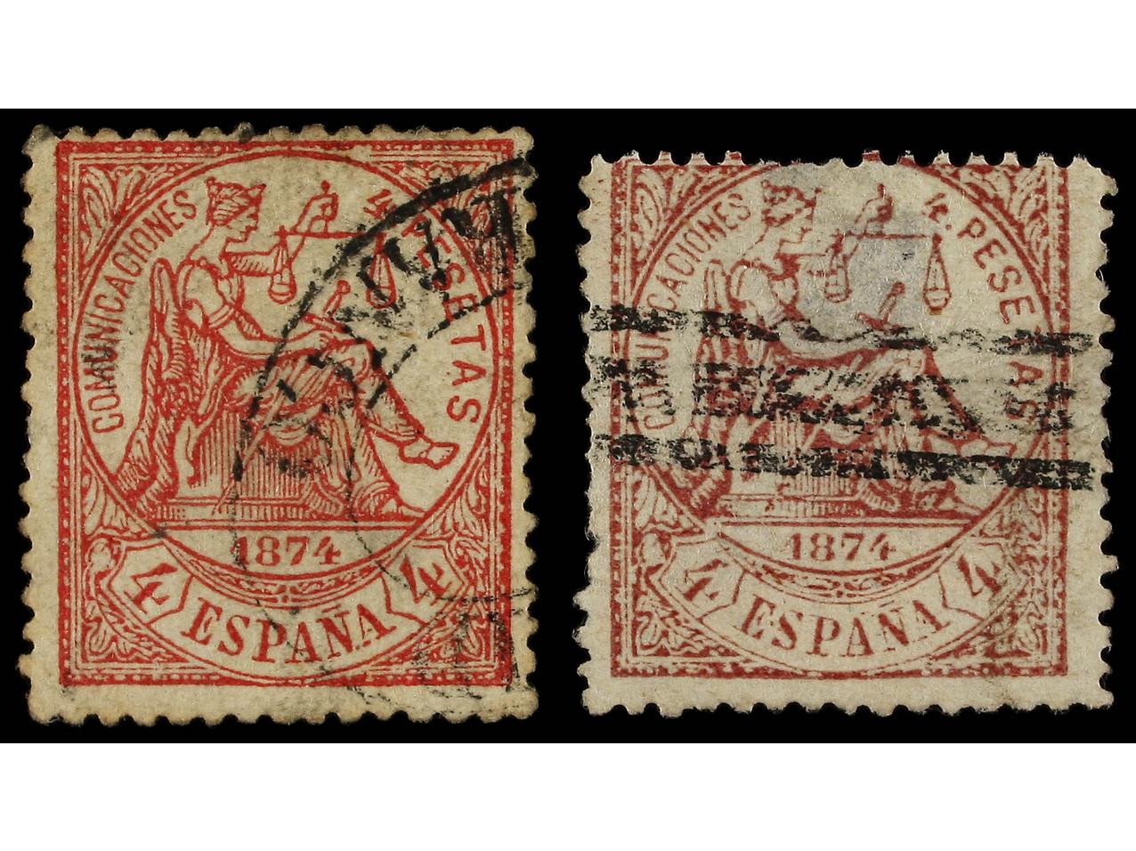 ESPAÑA. 4 pts. carmín. FALSO POSTAL. Tipo I. 2 sellos, usado de favor y barrado. Ed.151F. (Image1) (Image2)