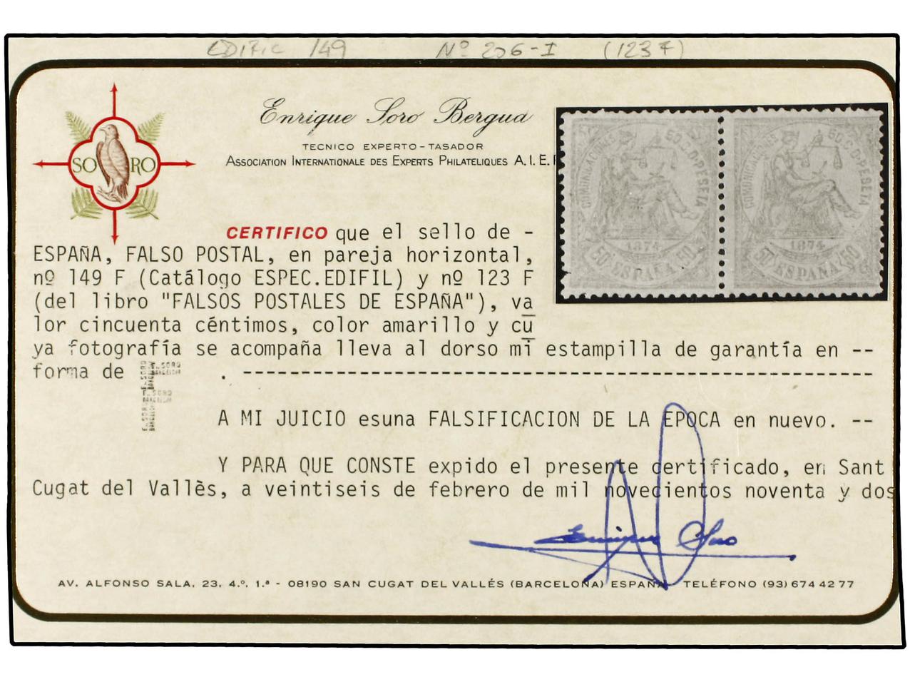 ESPAÑA. 50 cts. amarillo. FALSO POSTAL. 4 sellos, una pareja y dos sueltos, diversos tonos de color. Ed.149F. (Image1) (Image2)