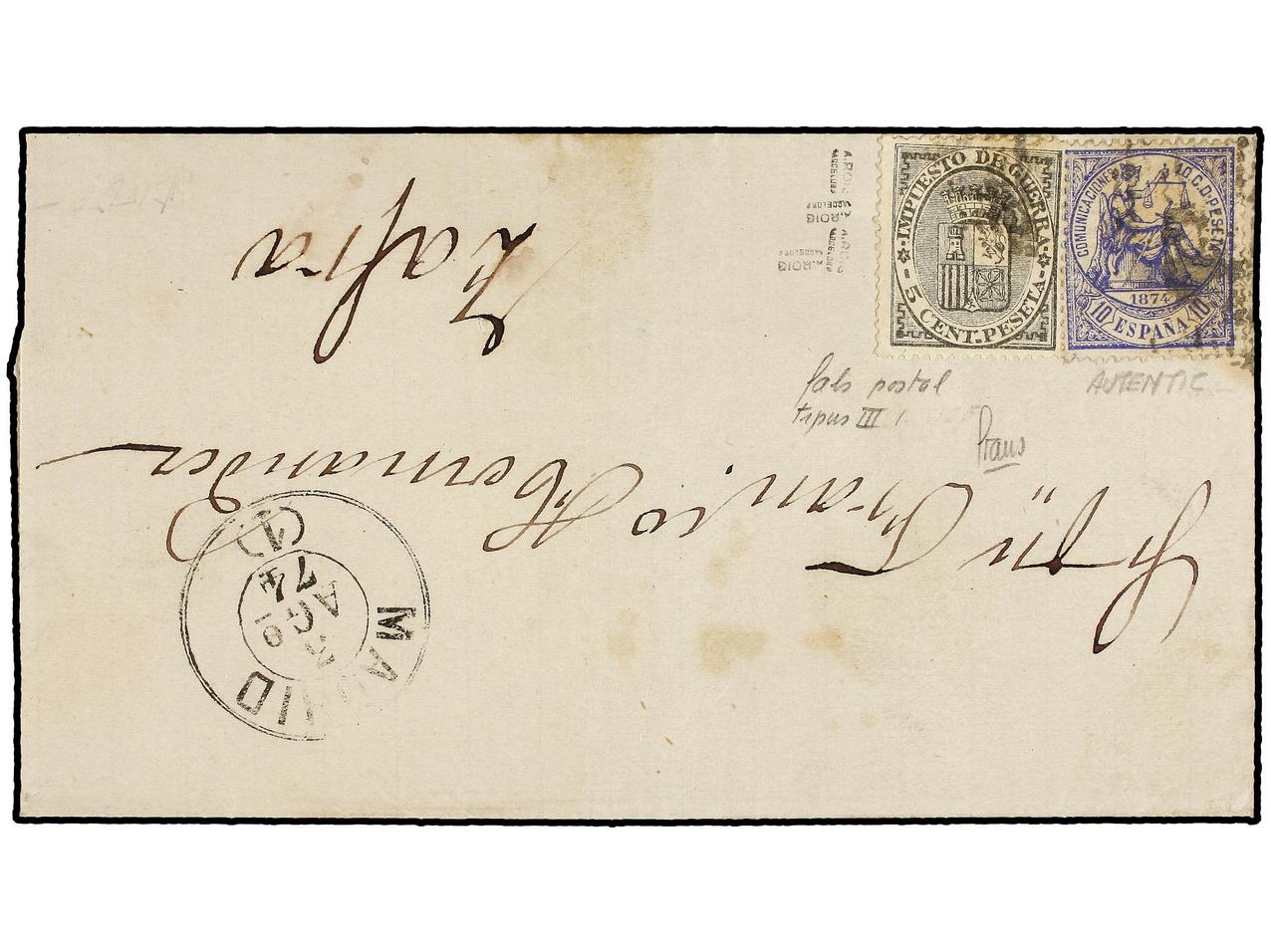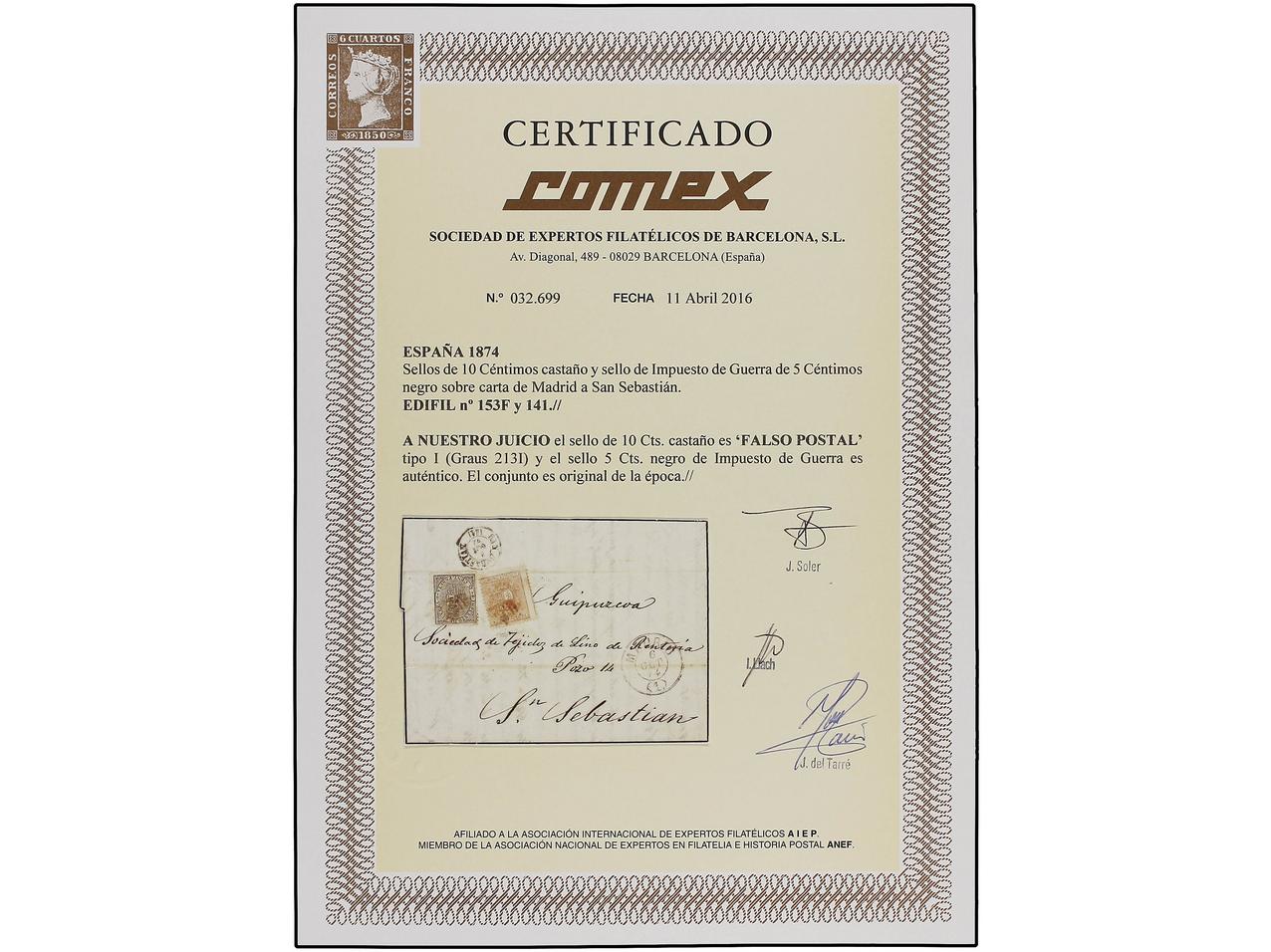 ESPAÑA. 1874. MADRID a SAN SEBASTIAN. 10 cts. castaño, FALSO POSTAL, tipo I con sello de 5 cts. negro de Imp. de Guerra auténtico. MUY RARA. (Graus 213 I). Cert. COMEX. Ed.153F. (Image1) (Image2)