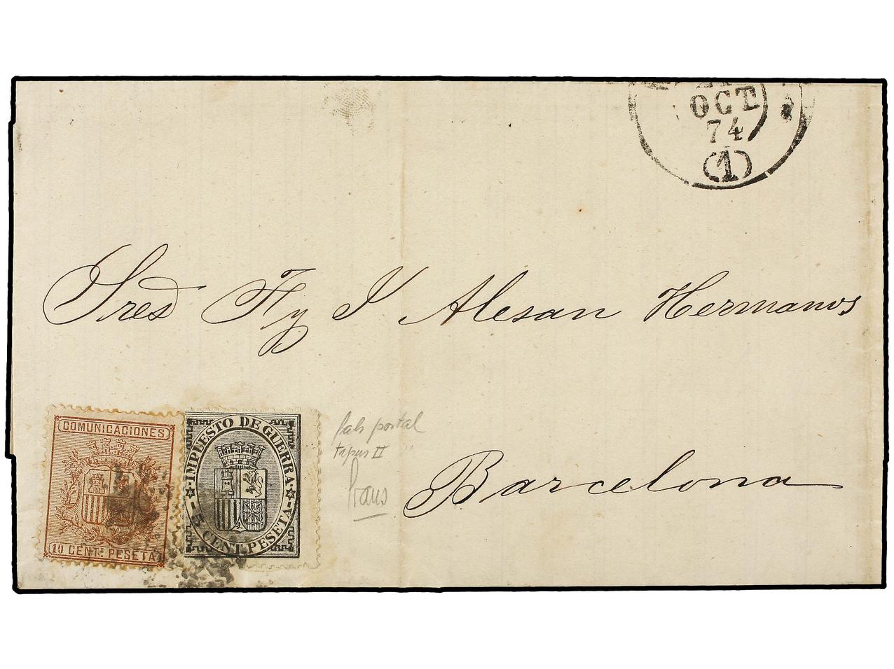 ESPAÑA. 1874. MADRID a BARCELONA. 5 cts. negro FALSO POSTAL tipo II y sello auténtico de 10 cts. castaño. MUY RARA (Graus 191 II). F. GRAUS. Ed.141 F, 153.