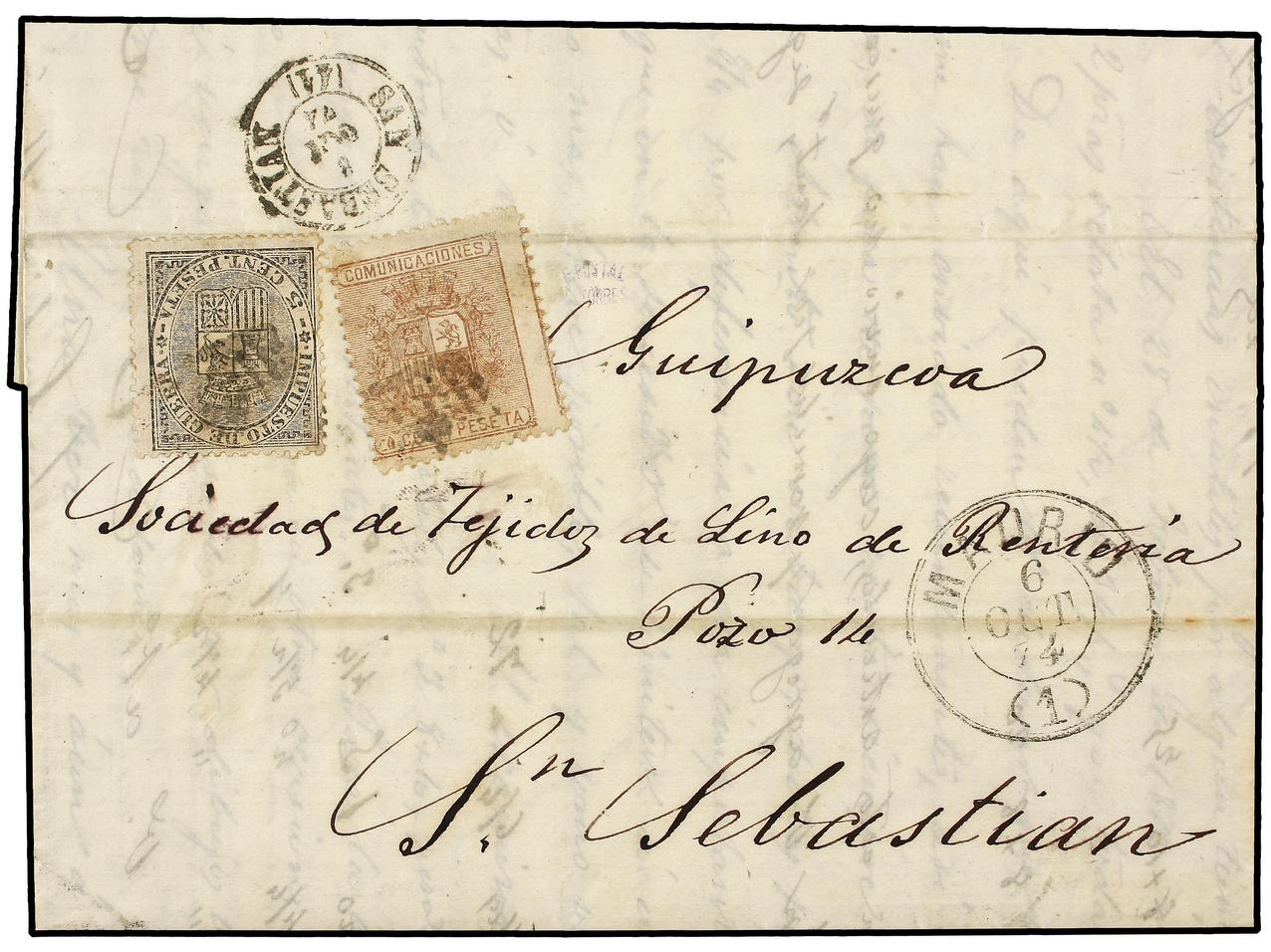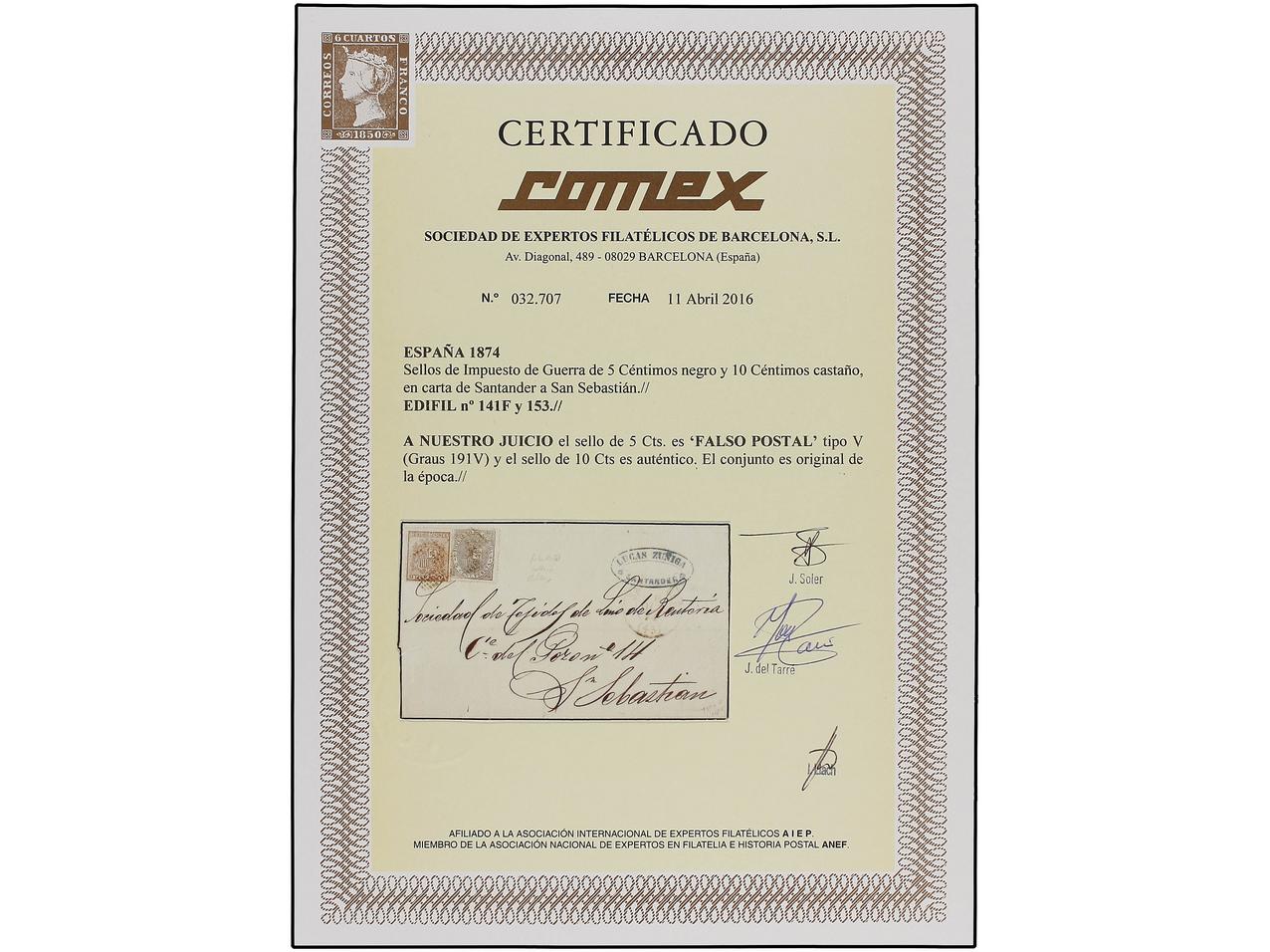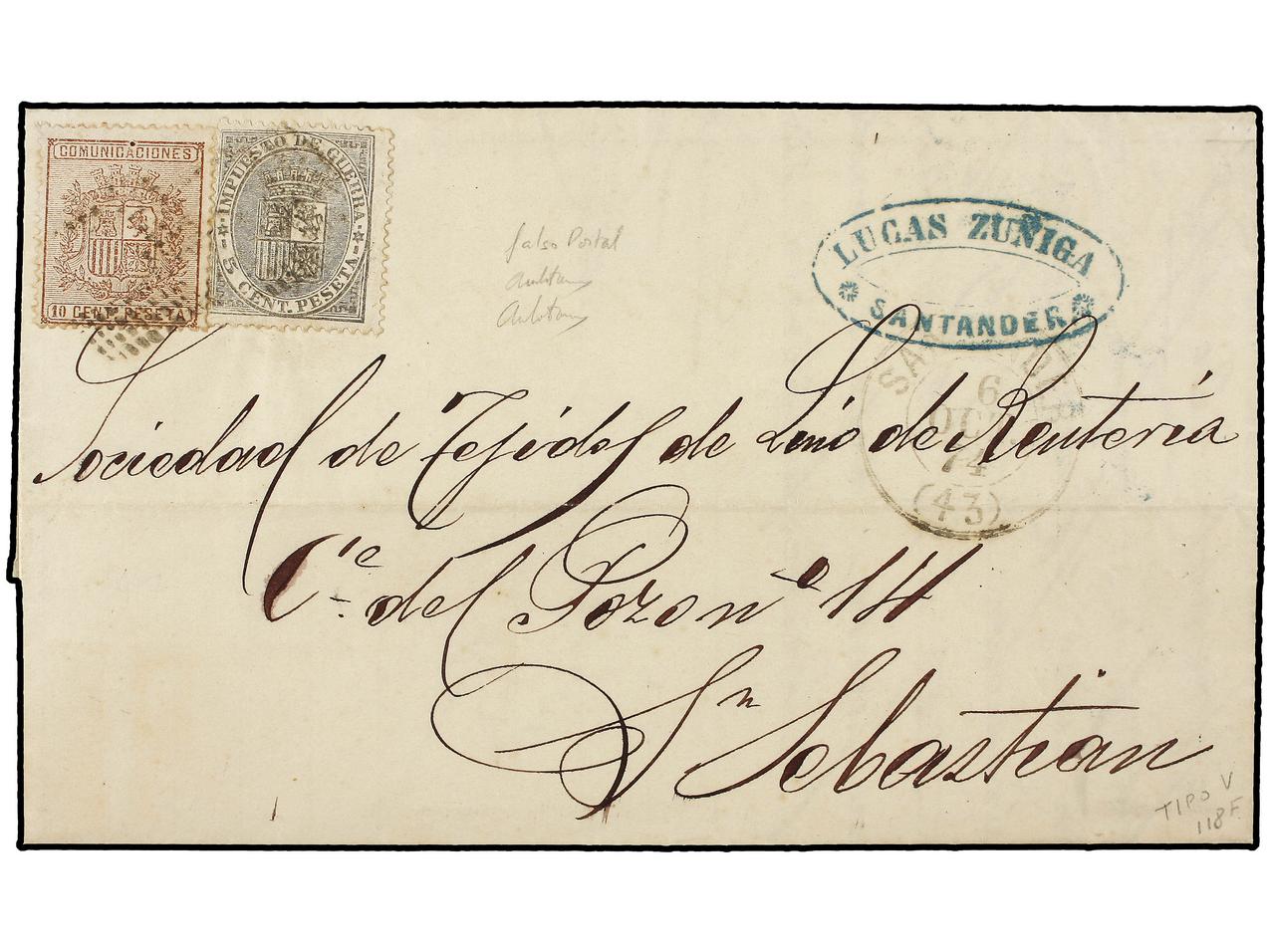 ESPAÑA. 1874. SANTANDER a SAN SEBASTIÁN. 5 cts. negro FALSO POSTAL tipo V y sello auténtico de 10 cts. castaño. RARÍSIMA (Graus 191 V). Cert. COMEX. Ed.141 F, 153. (Image1) (Image2)